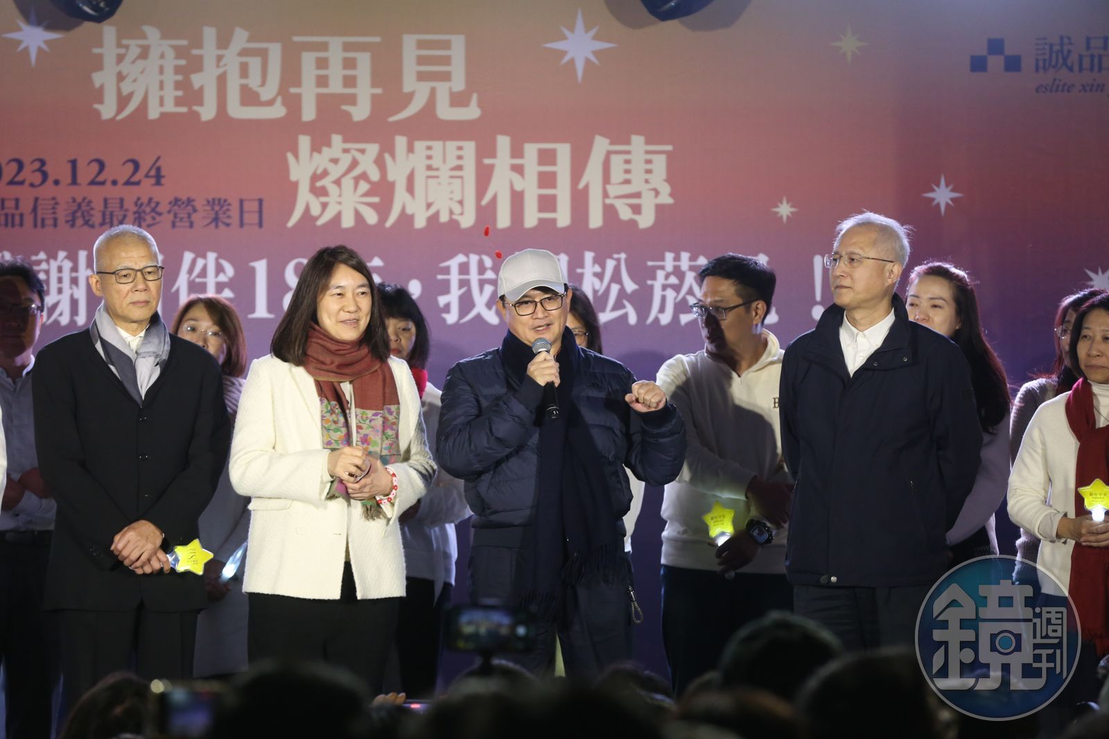 「過去1個月內,誠品信義店要被搬空一半了,不到30天賣十萬冊書,這其中非常多人是20幾歲、30幾歲的人,這真的是一個年輕的閱讀世代與族群。看完這整個便利貼海,給我們所有誠品團隊很多信心,這上面承載著大家的回憶跟祝福,讓我們持續勇敢往前走。有時候感覺我們很渺小,但只要我們懷抱真誠、善意,這些正念都會影響我們的環境,我們會試著呈現我們最好的面。」對面的101特別點燈寫道:「再見!信義誠品!」選在24日平安夜晚間率領員工與支持民眾一起道晚安,信義誠品準備熄燈前,誠品董事長吳旻潔站在舞台感性地說。