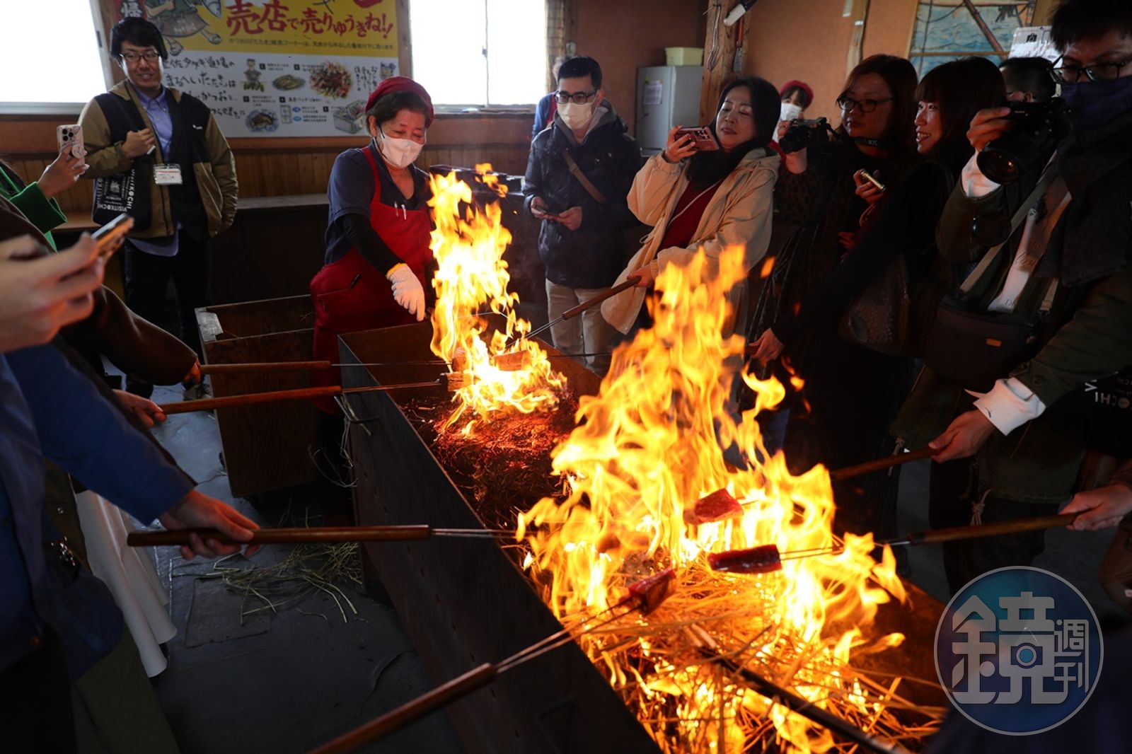 如果想親身體驗用稻草炙燒鰹魚,可以前往距離高知城約半小時車程的「土佐鰹魚道場」。店家會提供一支已經插好鰹魚肉的鐵叉,讓你用烈火豪邁地烤它約一分鐘,接著交給店員切片、擺盤,再組合成定食。