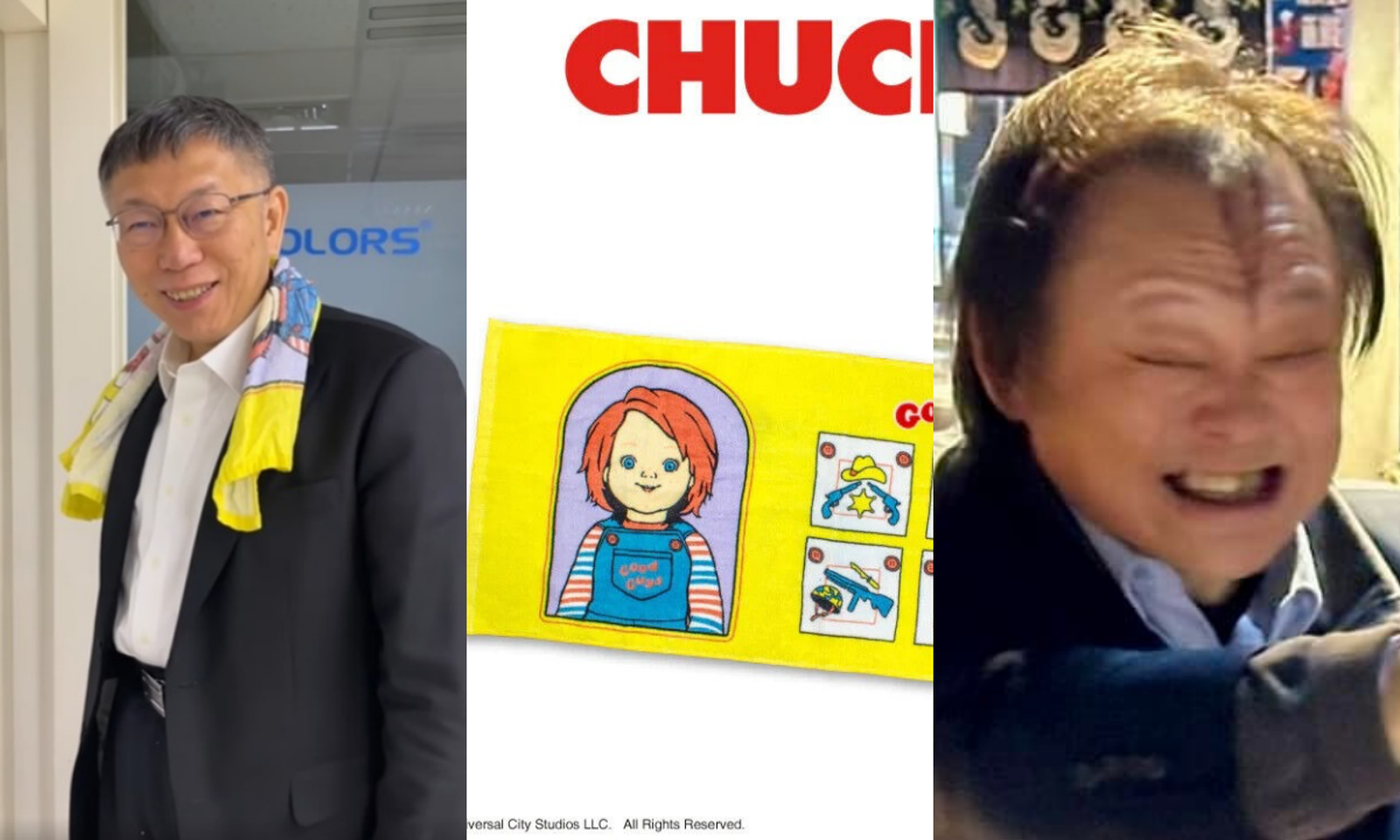 資深媒體人樊啓明今日在臉書分享一段影片,畫面中柯文哲脖子上掛著一條黃色毛巾,在辯論會開始前先去洗把臉,過了不久樊啓明再發文,指出柯文哲身上掛的毛巾,圖案竟是恐怖娃娃「恰吉」。