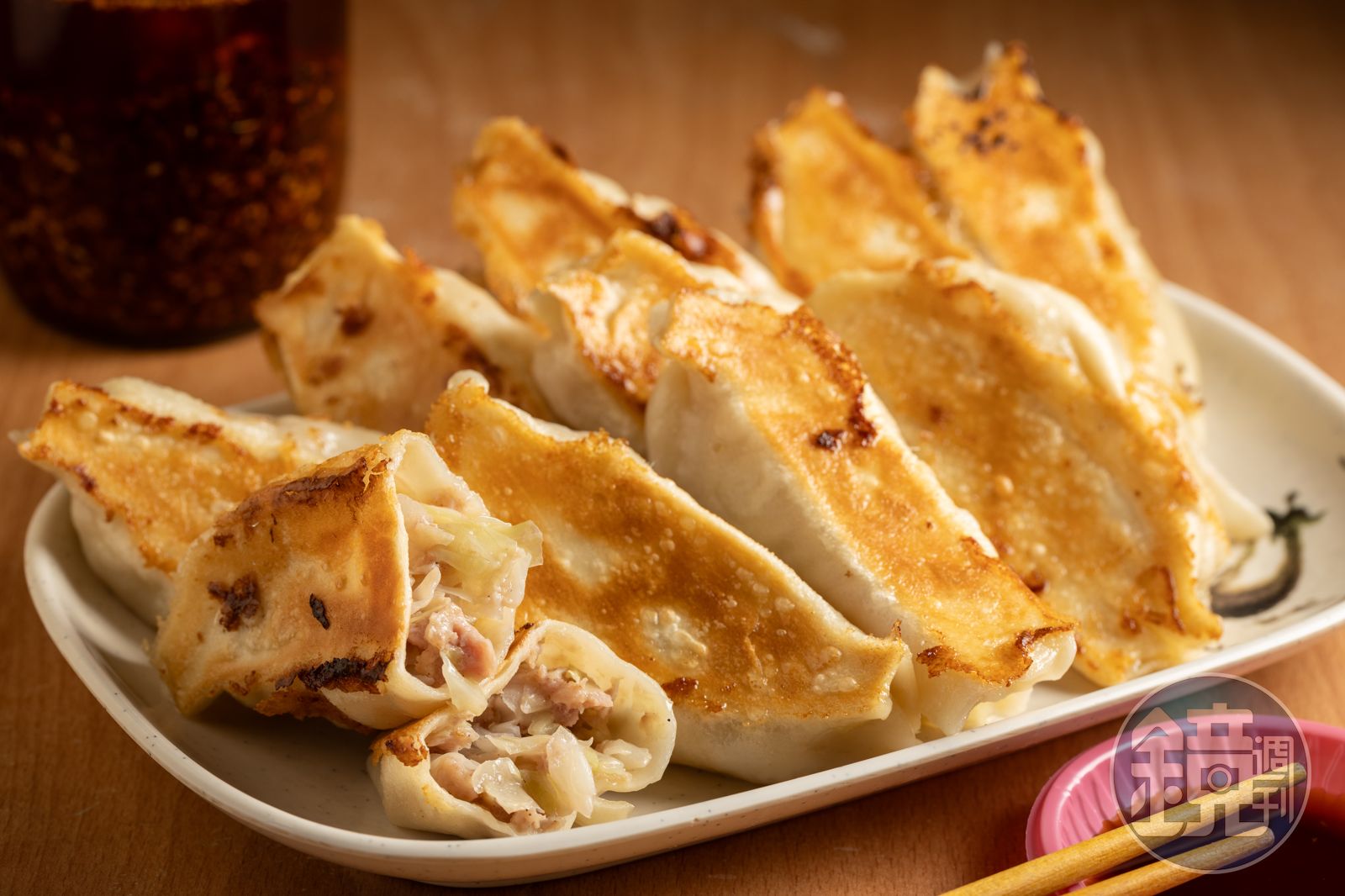「深坑黑豬肉鍋貼水餃」最出名的是底部煎得微焦的「鍋貼」,口感略油一些,麵皮有彈性,肉末甜嫩,高麗菜也維持爽脆,沾點蒜蓉醬油更夠味。「高麗菜水餃」口味與鍋貼相近;「韭菜水餃」的香氣則突出許多。