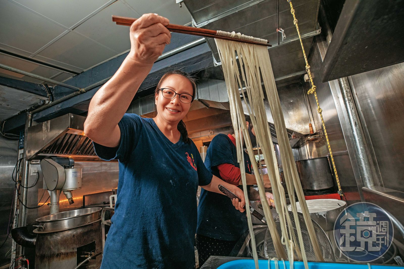 高瑜含迫不及待分享製作流程,「我們的粉為什麼特別Q,來廚房看過就會放心,原物料就是台灣純地瓜粉,甜度高的台農57號地瓜,坊間常見的調和地瓜粉為了便宜會加入樹薯粉或玉米粉,口感都不對。」地瓜粉加水打成粉糰,過洞篩搖晃成粉條入滾水,煮30秒迅速撈起,製粉動作一氣呵成,不容半點拖延,「慢了粉就會爛爛的,搖晃的高度和力道也會影響粉的粗細口感,機器做不來,我都搖到肩膀和手臂腱鞘炎,要固定去針灸復健。」