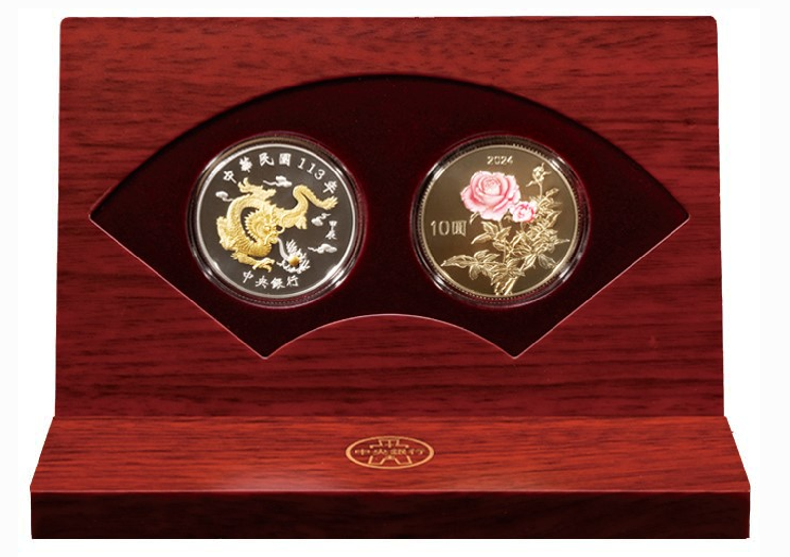 「甲辰龍年生肖紀念套幣」採銀幣(面額新台幣100圓)及銅合金幣(面額新台幣10圓)各一枚組合成套。央行說明設計理念,銀幣含銀1英兩,正面以局部鍍金的「龍」圖樣為主題,背面是代表台灣藝陣文化觀光重要活動之一的「高雄內門宋江陣」;銅合金幣正面以「祥龍戲珠」為主構圖,背面則為部分上彩的「玫瑰花」。