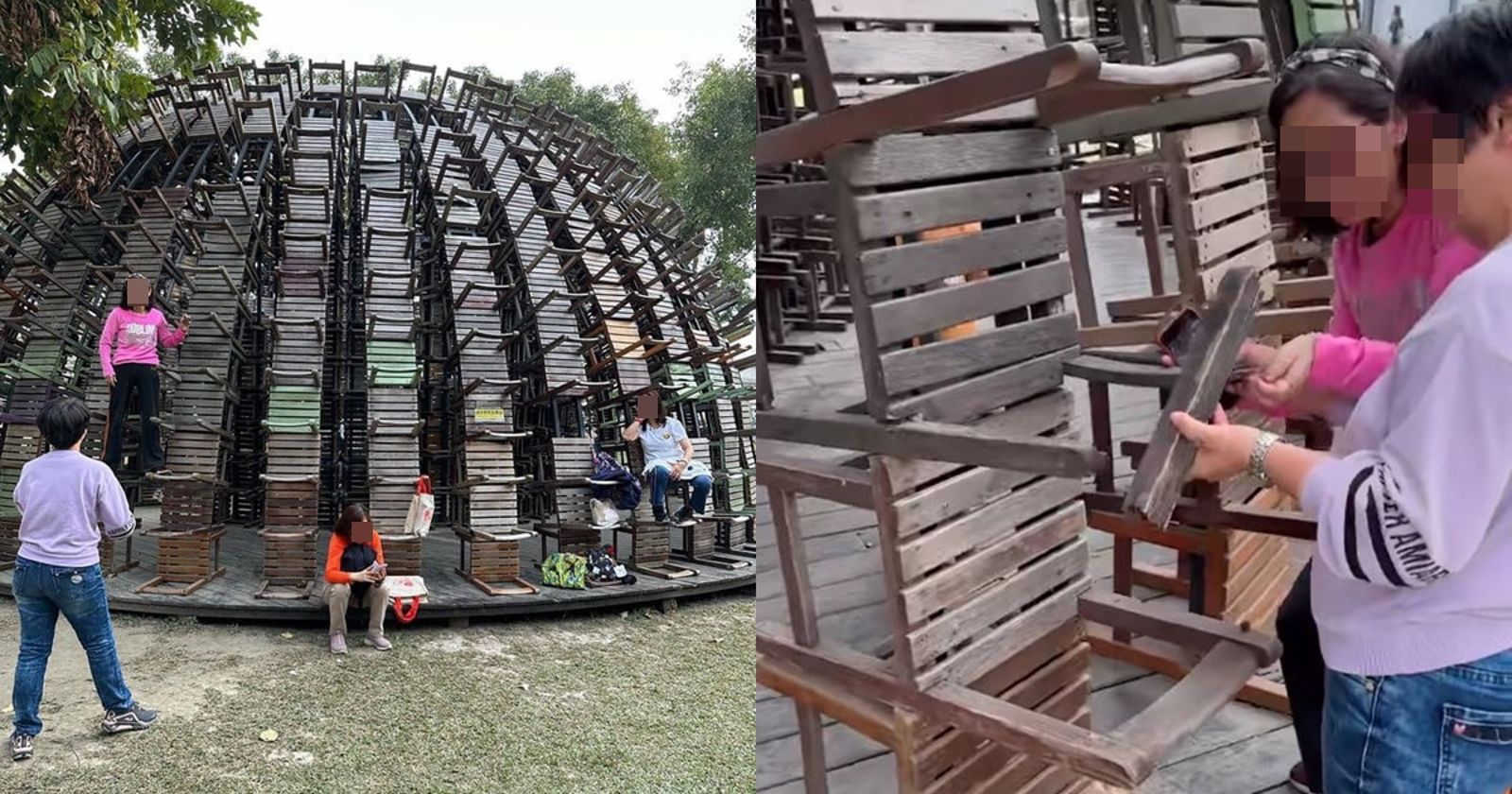 另一支影片則顯示,桃紅T女子與幫她拍照的紫衣女手裡拿著斷掉的椅背木條,似乎在研究該怎麼把木條拼回去。誇張行徑讓網友傻眼,「唉,世界上最不缺的就是這種人,人家好好的藝術品一定要去破壞人家,還自以為在拍美照?」「裝飾藝術不能碰觸是基本的常識吧!?弄壞又要怪現場沒人跟我說..」「這下搞笑了吼」。