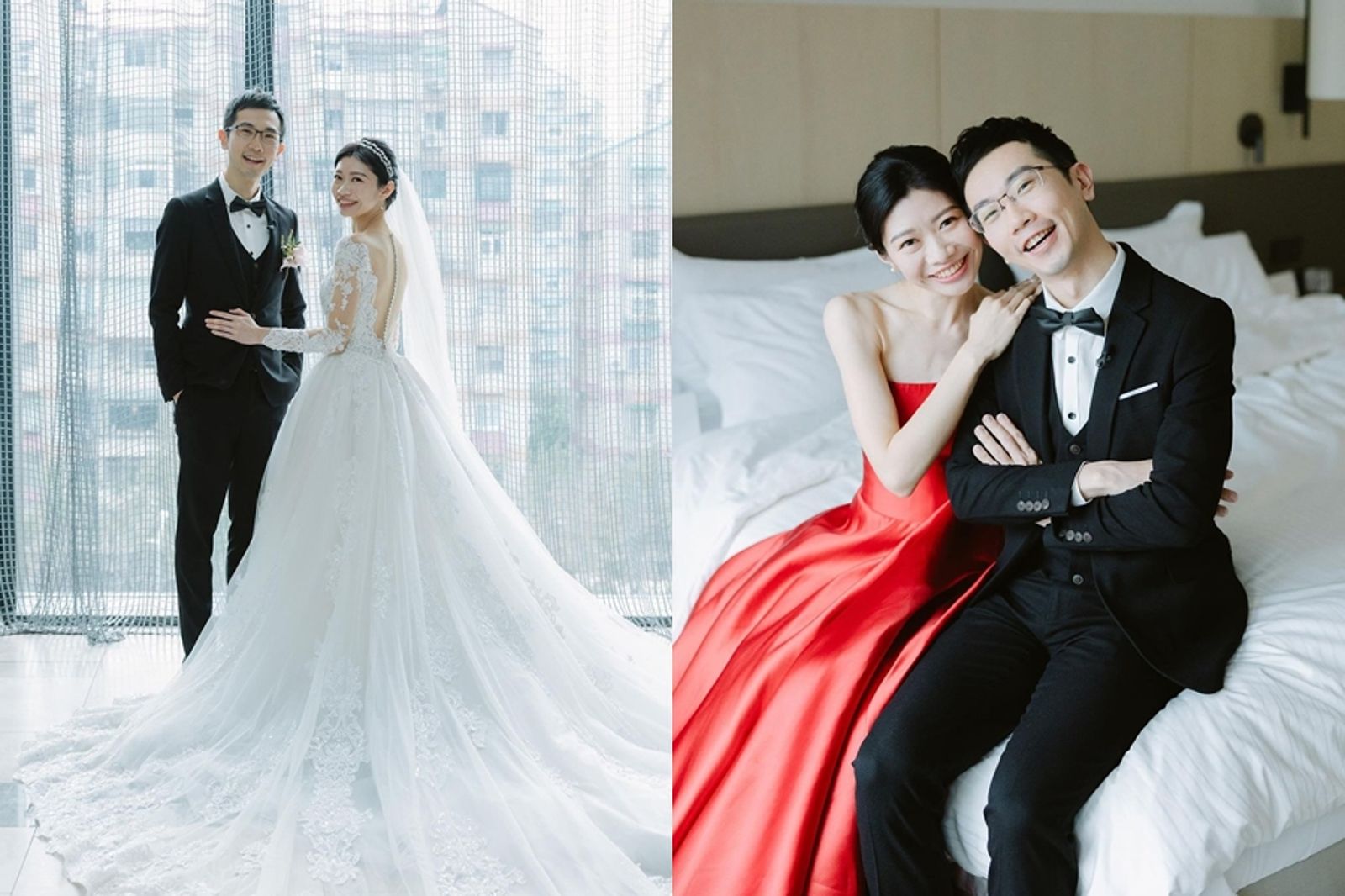 蒼藍鴿老婆曝光,被誇讚很漂亮。(翻攝自@bluepigeon0810 IG)只見照片中,他和老婆分別穿上西裝與婚紗,對著鏡頭甜笑,兩人在台北萬豪酒店舉辦婚禮,照片中還有兩人一同扮鬼臉、新郎掀新娘頭紗與致詞等照片,場面十分動人。