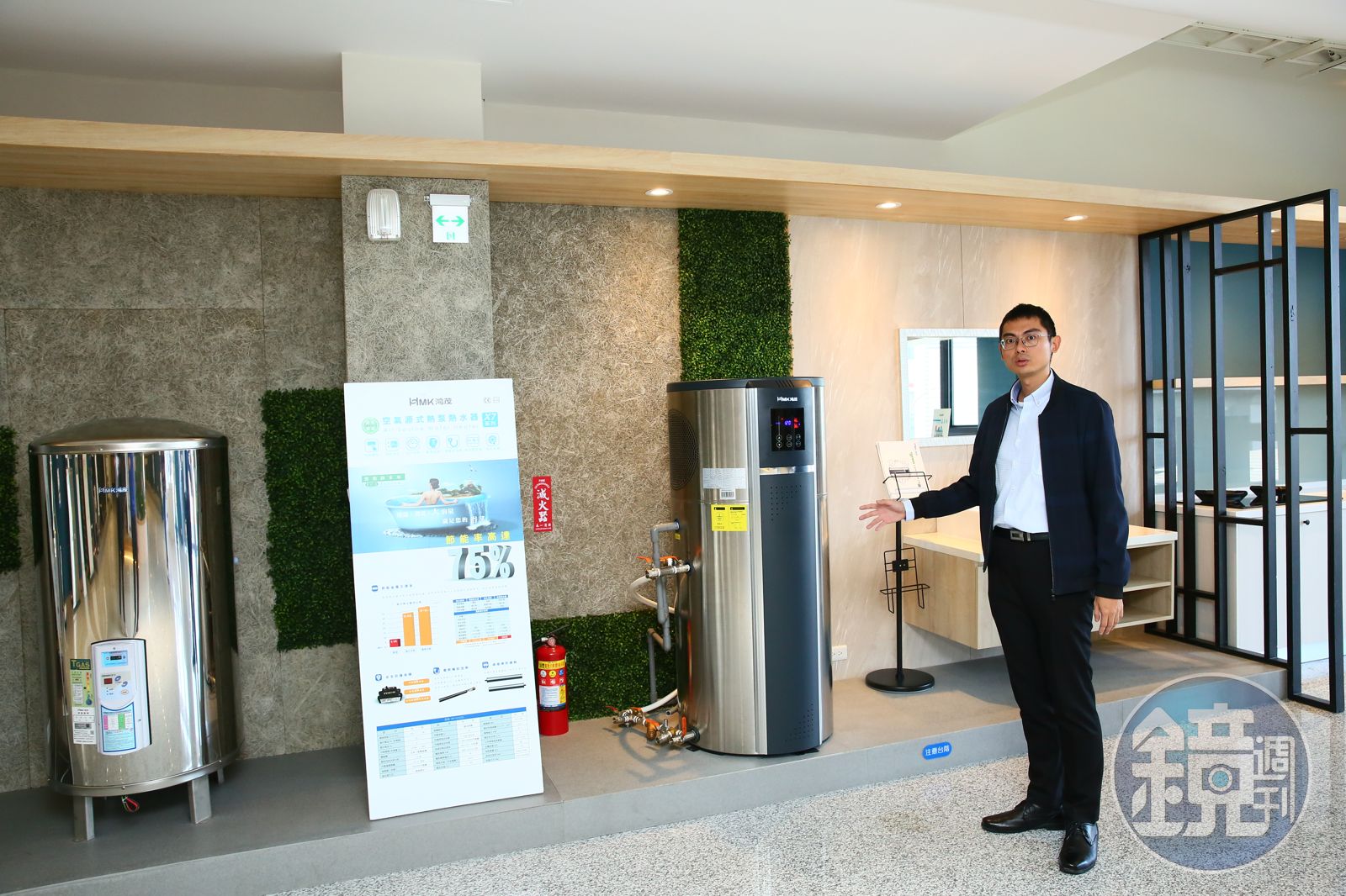 在董事長支持下,王浩政更發展出多元的各式廚具、淨水設備,其中之一就有熱泵式熱水器,這是目前別墅、豪宅的安裝趨勢,熱泵式熱水器,他解釋道:「熱泵熱水器跟冷氣原理相似,只是運作上是相反的,空調冷媒吸熱把熱空氣排出,但我們恰恰相反、要的熱源,把熱空氣用到加溫冷水上,來形成熱水。省電可達電熱水器的75%,但價格高卻是不爭的事實,想利用它來省荷包,需要大量使用、和得靠長時間下來的轉換率。」事實上,由於熱泵熱水器跟冷氣一樣,可以一對多安裝,工地現場、民宿也會採用。