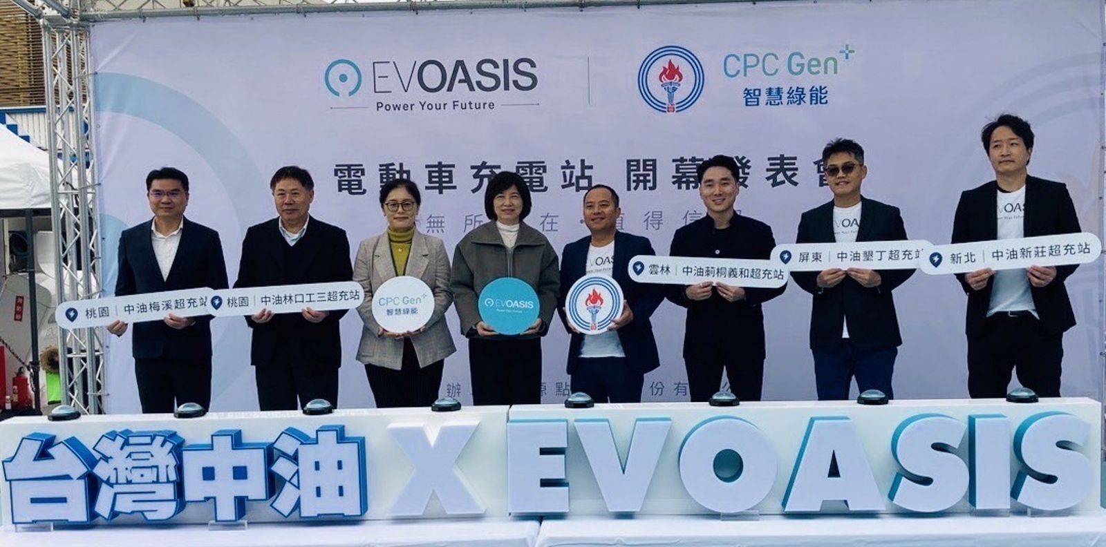 EVOASIS今日於桃園市龜山區林口工三加油站舉辦「電動車充電站」開幕儀式,揭開雙方合作經營序幕,代表著雙方對於台灣能源轉型的重視,建立良好的充電網絡,提供消費者優良的充電環境。