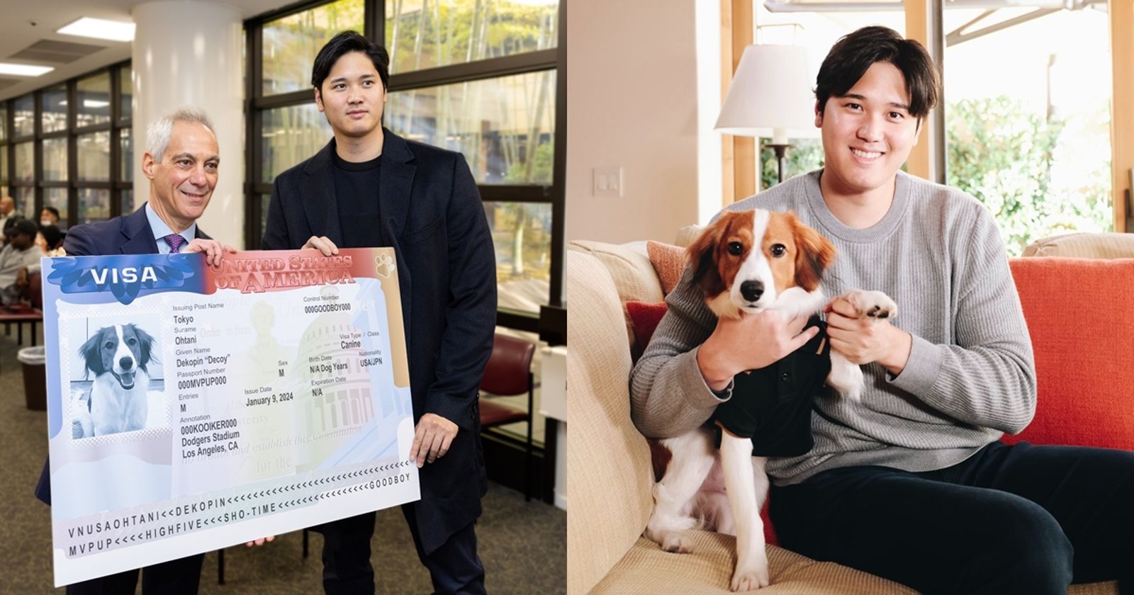 拉姆·伊曼紐爾今日在X分享2張與大谷翔平的合照,一張是他頒給大谷翔平的愛犬Dekopin(デコピン,彈額頭之意;另有英文名Decoy)的特大號簽證,從上頭的資訊可以看到,Dekopin是個小男生,擁有日本、美國雙重國籍,簽證類別是犬,護照號碼為「000MVPUP000」,下方的識別條碼還藏有「HIGHFIVE」「SHO·TIME」「GOODBOY」等字詞,相當可愛。另一張則是大谷翔平致贈拉姆·伊曼紐爾親簽道奇球衣。