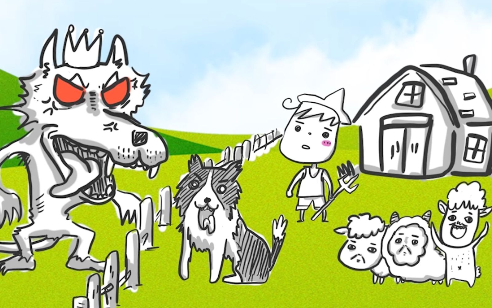 後來農場主人並未接受狼大王的條件,反而還多養了兩隻牧羊犬,之後狼大王就不敢亂跑進農場搗亂,最後寓言旁白表示,「或許在狼大王的眼裡,農場主人和牧羊犬只要活著,就是挑釁。」
