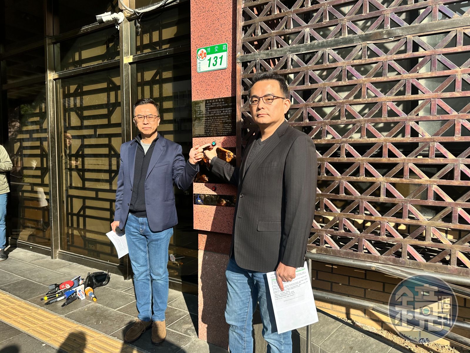 黃子哲(左)到台北地檢署按鈴申告黃國昌涉嫌誣告及加重誹謗罪。發布時間:2024.01.12 15:57 臺北時間
