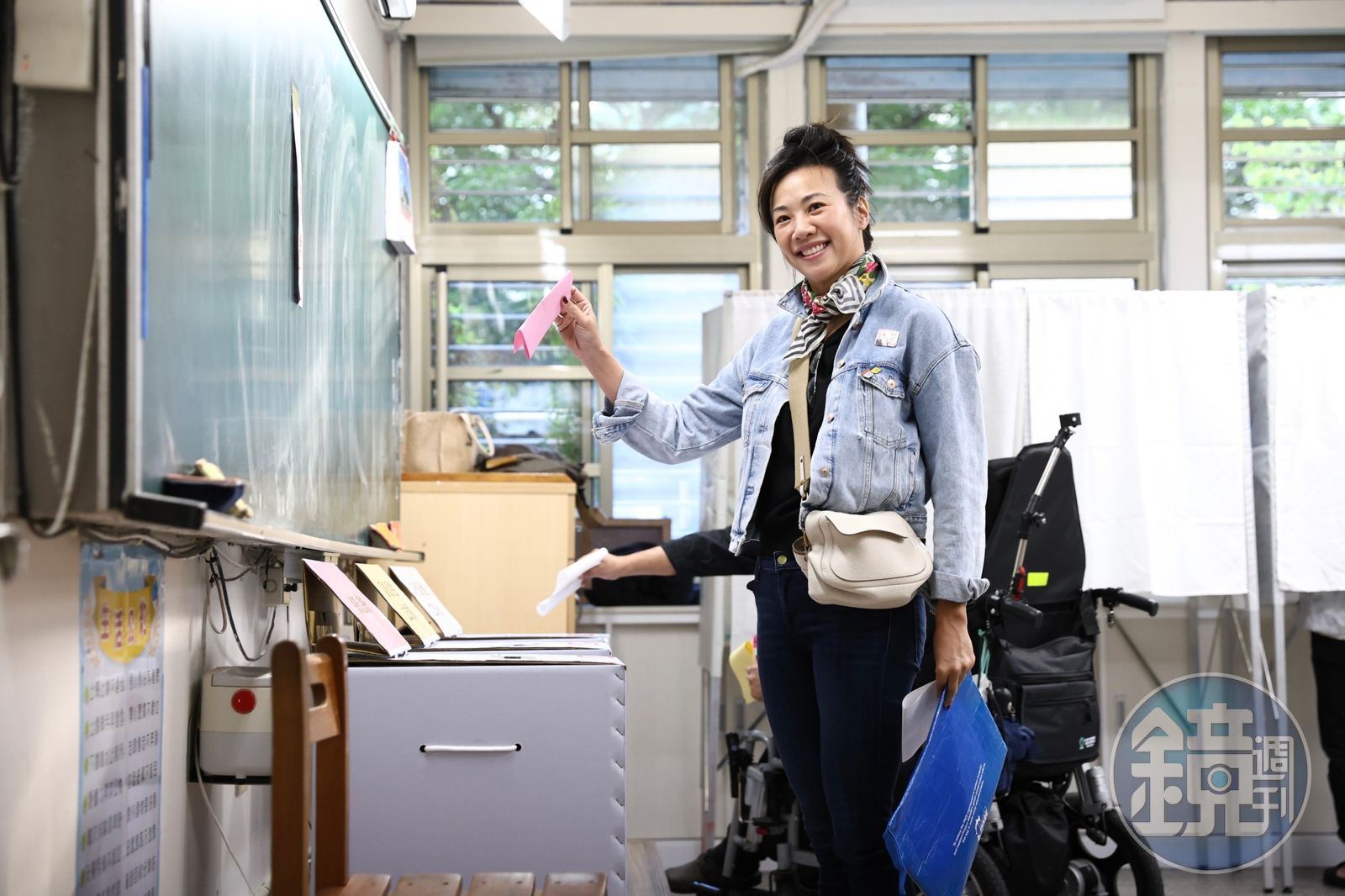 而吳欣盈進入投票所後,還熱心協助一旁的身障者,拉起布簾,方便對方投票。