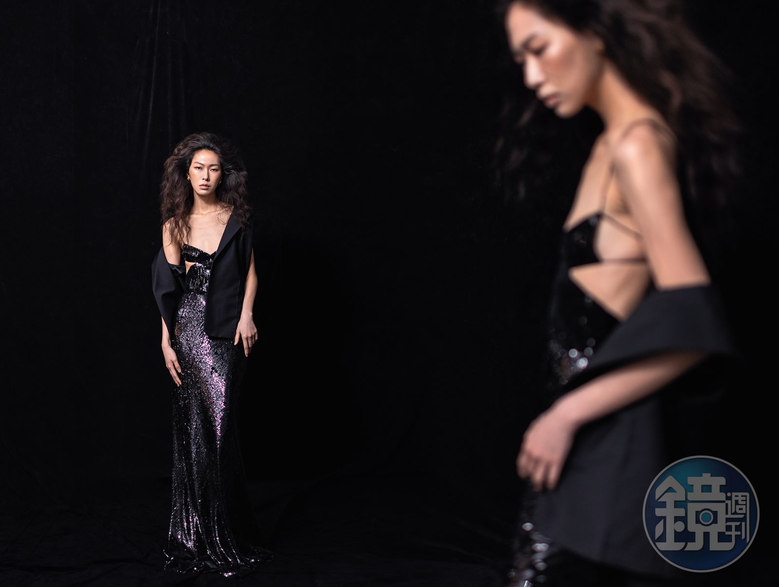 宛如夜晚湖水波光的亮片,讓人遐想不斷的細繩,感覺危機一觸即發,一件恰到好處的西裝背心,不僅提供了安全感,更在脫下的瞬間,吸引目光。