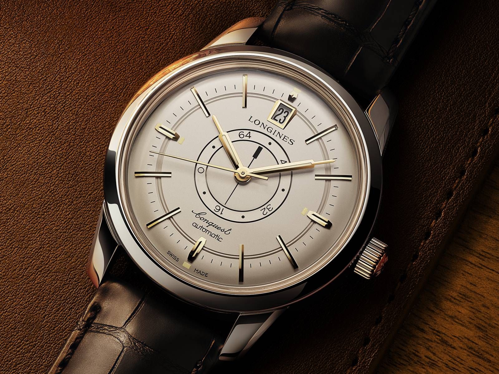 浪琴這款「征服者系列」復刻中央動力儲存腕錶,搭配38毫米錶殼,搭載浪琴獨家開發的L896.5自動上鍊機械機芯。其動力儲存顯示由兩個圓盤組成,外圓盤的數字刻度從0至64;而內圓盤的線條刻度,則指示剩餘的運行時間。