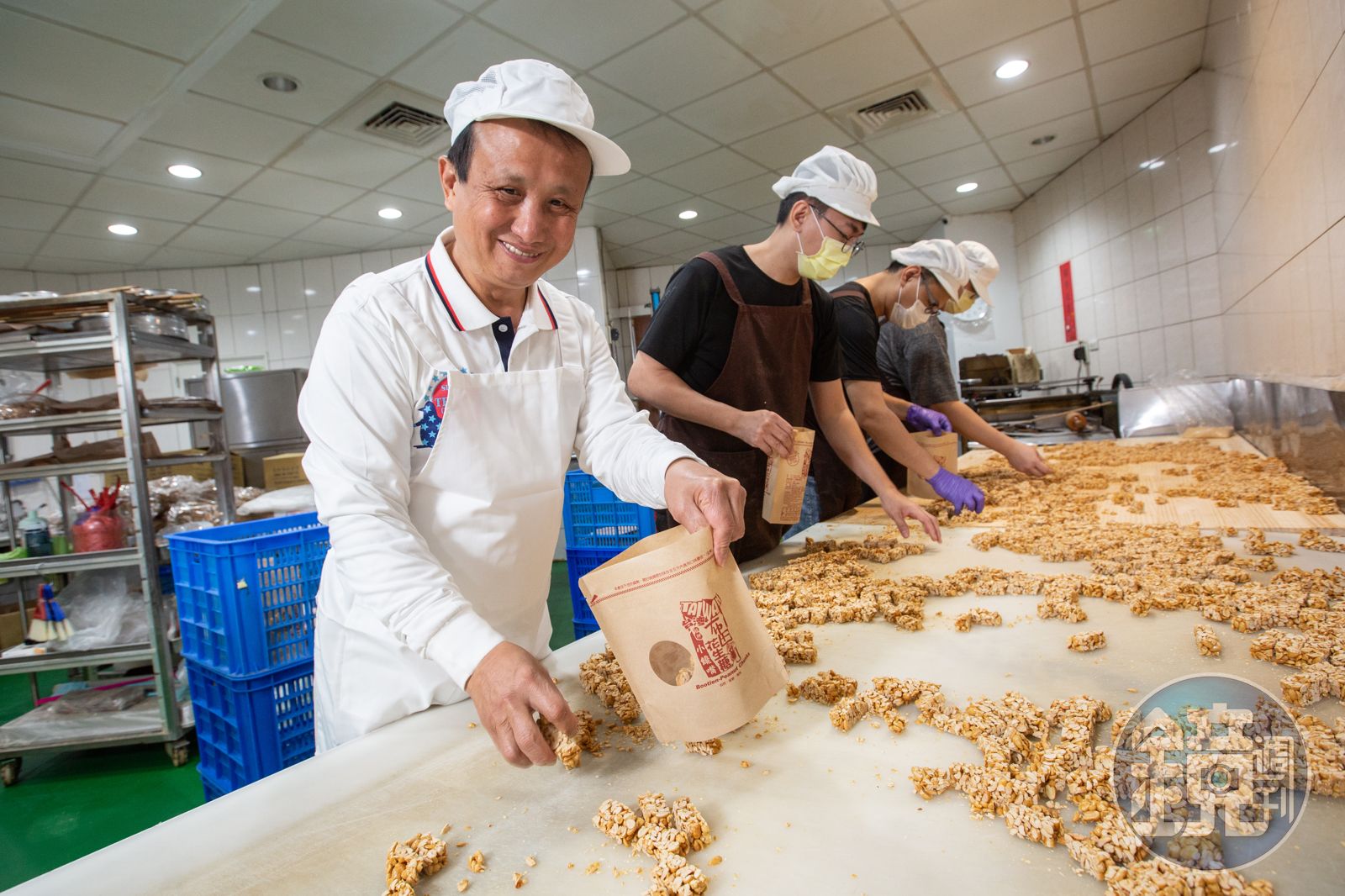 廚房如戰場,陳錦村待在裡面,表情一直緊繃,唯有介紹產品時,眉宇間才稍微放鬆,「我們花生都是雲林產的,比進口花生1斤貴40元,但不容易有黃麴毒素,而且選16號花生,比較輕盈,不容易有油耗味,政府每半年都來抽查一次。」67歲的他,國小跟著父親做花生糖,對於花生糖製程瞭若指掌,「外面很多花生會油炸後再裹糖,速度比較快,但這樣含油量太高,我們用70度低溫烘烤,有香氣又不會焦。」