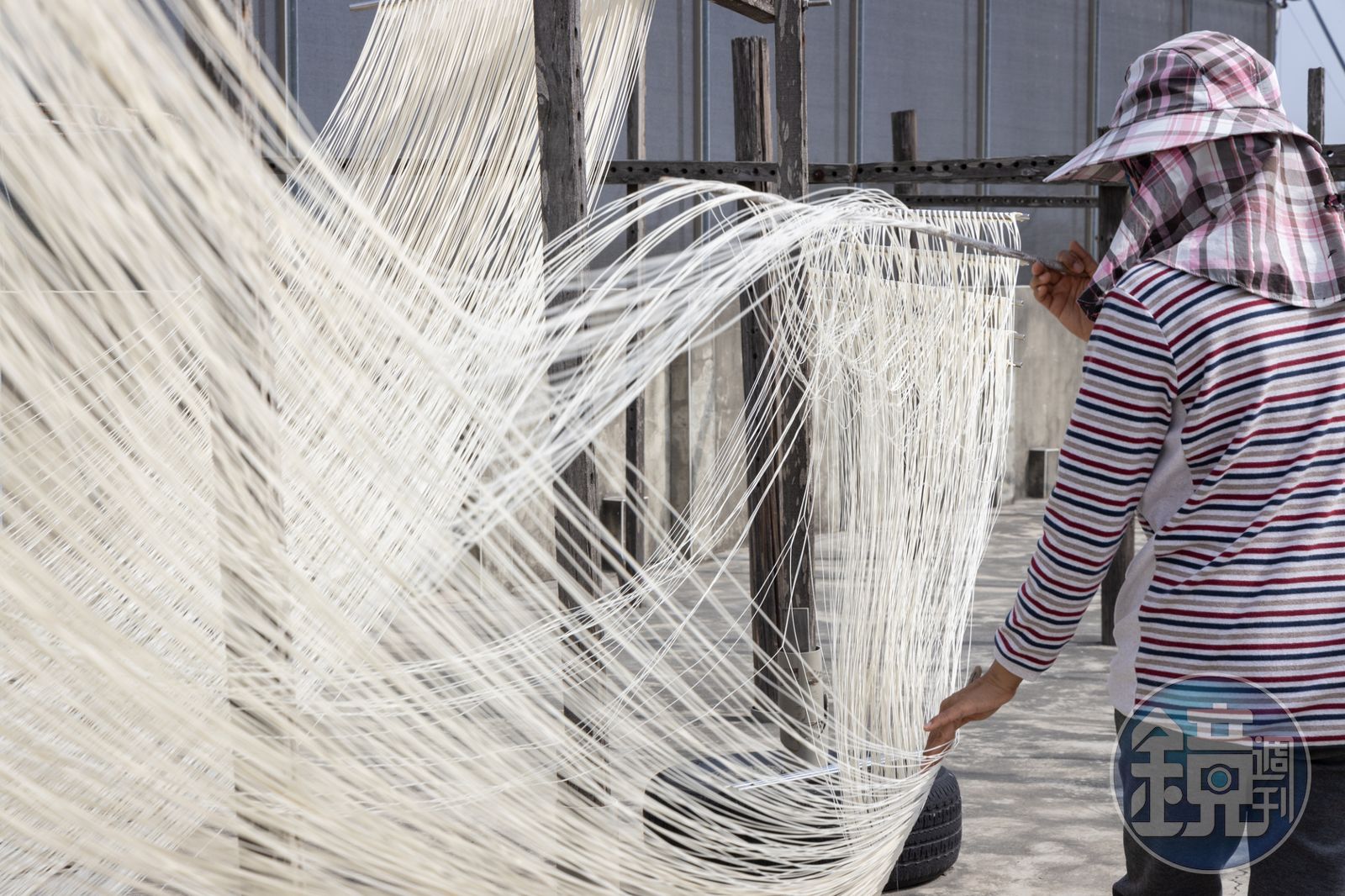 只見蔡隆琨手指夾住5根竿子,三兩下就將麵條拉成千絲萬縷,藍天下有如滔滔白浪,接著還得讓麵線曬上暖暖的日光浴,待其乾度適中,才能收麵。蔡隆琨透露,每日必須依照天氣與溼度調整製程,麵線好吃的重點在於手工拉麵,這步驟雖然讓製程多出好幾個小時,卻使得麵體口感Q度大增。由於目前僅有他與妻子兩人製麵,每日最多生產100斤,無論年節送禮或自家煮食都得提早預訂。