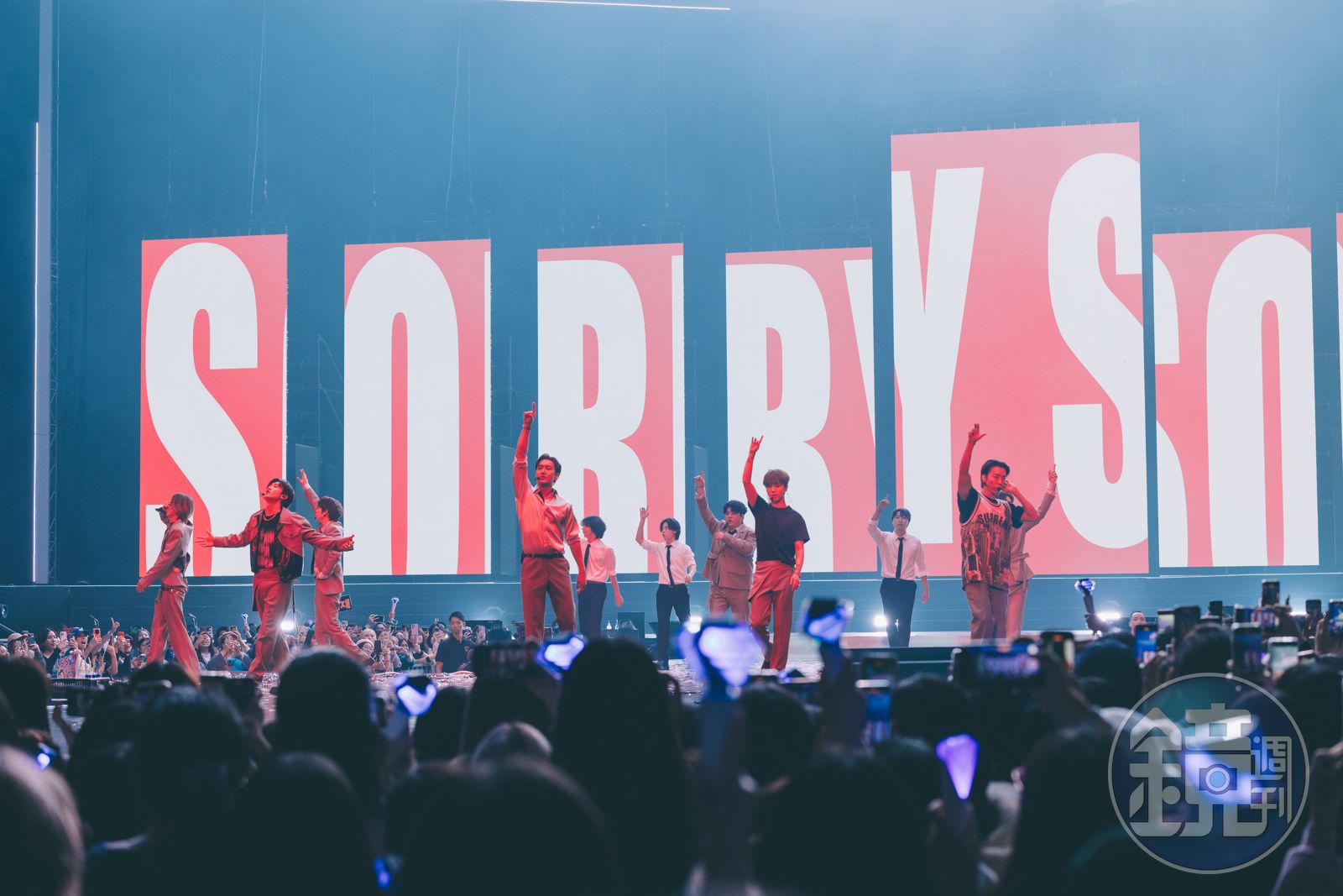 昨天抽到雄中外套的神童,今天得到了夯劇《想見你》鳳南高中制服與書包,神童套上制服後自言自語:「最近衣服都出很小件耶。」而圭賢得到印有利特臉的亮片抱枕,讓成員玩得超開心,利特「善意提醒」大家:「這是我的臉啊,你們這些傢伙。」當被問想自創SJ小分隊時,東海想讓利特、藝聲、圭賢和始源組成舞蹈團體「TSKY」,圭賢則點名利特、神童和藝聲,小聲地說:「團名就取SUPER JUNIOR 老人…」始源說:「還是取名SUPER JUNIOR 40?」讓藝聲不服氣地說:「但我看起來比你年輕耶。」展現出道19週年組合的默契與詼諧。而又掀起另一波高潮的時刻,是成員被要求「身體力行表達對粉絲的愛」,厲旭先以高難度頭頂愛心下腰讓大家掌聲不斷,沒想到圭賢一個前滾翻加頭頂愛心炸翻全場,年紀最大的利特也作出翻滾動作,卻是讓大家關心他有沒有跌傷,厲旭主動加碼做出瑜伽的「頭倒立」動作,連始源都忍不住對他說:「尊敬!尊敬!」