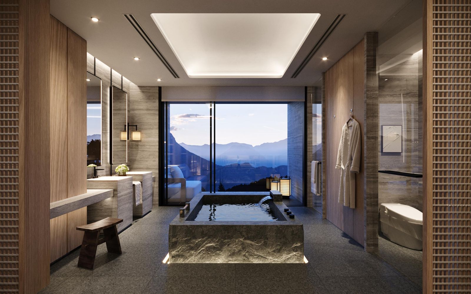 台灣第一家凱悅渡假酒店將於Q3見客,由興富發集團興建擁有,凱悅酒店集團(Hyatt Hotels Corporation)管理經營。(新北金山凱悅渡假酒店提供)為迎接高端旅客,飯店設有211間客房及套房,房內設計以和洋禪風結合大地色系,基礎房型15坪起,十分寬敞舒適;每間客房皆設有陽台,可以遠眺陽明山景。此外,每間客房皆規劃了專屬泉池,賓客在房內就能盡情享受暖湯。