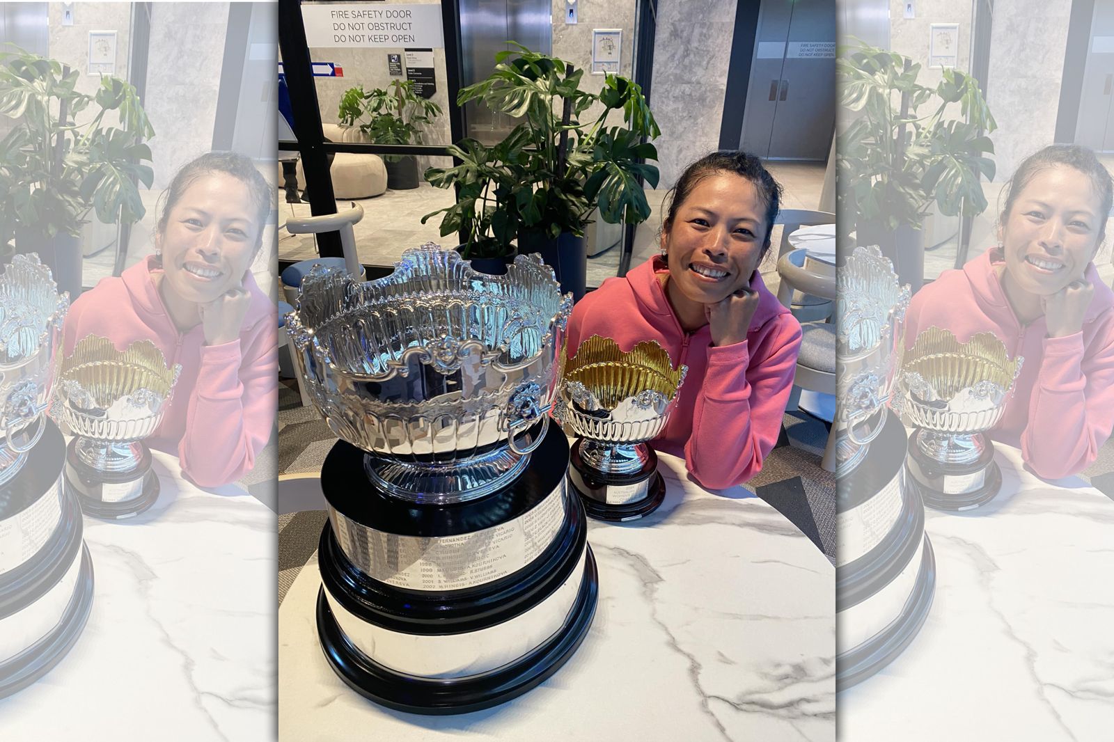 謝淑薇今日開心貼出和2座澳網獎盃的合照,並感謝大家對她的祝福。照片中謝淑薇綁著招牌馬尾頭,身穿粉紅色上衣,露出滿意微笑,「澳網獎盃好新奇,好可愛喔」,球迷隔著螢幕也感受到喜悅,留言祝賀「可愛的獎盃,可愛漂亮的妳,恭喜淑薇」「再次恭喜妳,真的太棒了。」