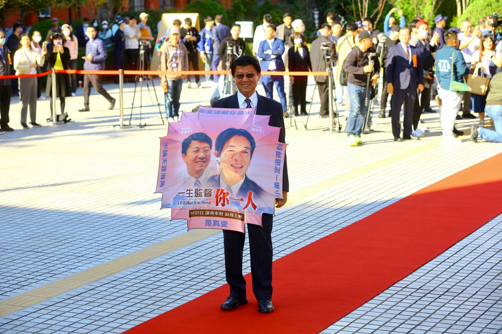 謝龍介今在臉書貼出自己的紅毯照,他穿西裝,手拿特製傘,上頭有他與賴清德的合照,印有斗大標語「一生監督你一人」「不論天涯海角」「小弟一定追得上」「是真愛」等,他還特別說明,這把傘是「陰晴兩用傘」。