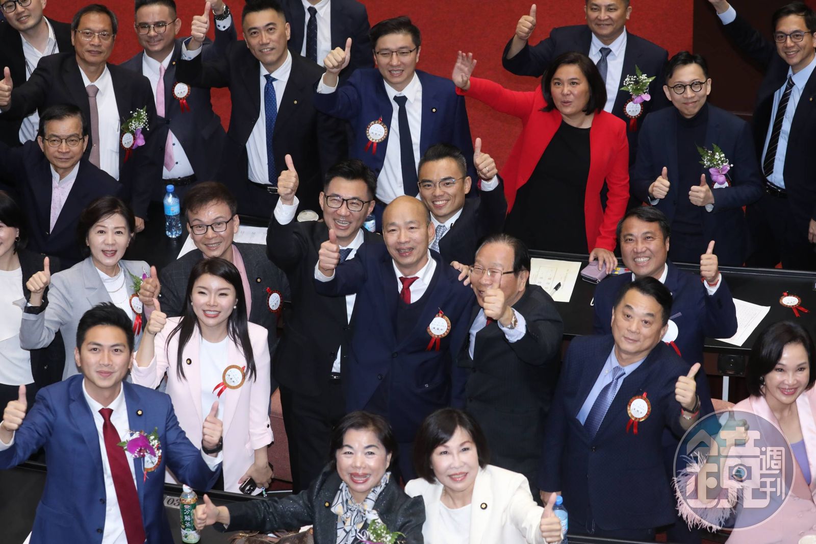 有趣的是,在開票唱票階段,議場內藍委本來一片安靜,隨著韓國瑜得票數來到50票時,藍委情緒愈來愈嗨,歡呼、拍手聲不斷;直到韓確定拿下54票,藍委將韓團團圍住,嗨喊:「韓國瑜當選!韓國瑜當選!」恭喜韓當選立法院長。