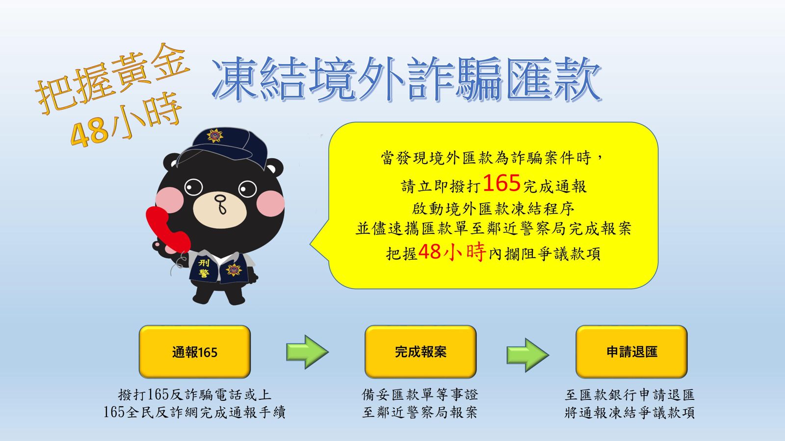 南部地區某一科技公司於去年接獲犯嫌竄改合作的外國廠商電子郵件來信告知因故須變更匯款帳號,受害的公司會計不疑有他於當月15日匯款美金約5萬元至其指定的外國銀行帳戶,後因外國合作廠商告知未收到該筆款項,遂趕緊向165通報,並至最近派出所報案及請求原匯出銀行圈存該爭議款項,同時刑事警察局國際科立即聯繫國際刑警組織向該國政府通報凍結該筆匯款,最終於48小時內成功申請退匯。