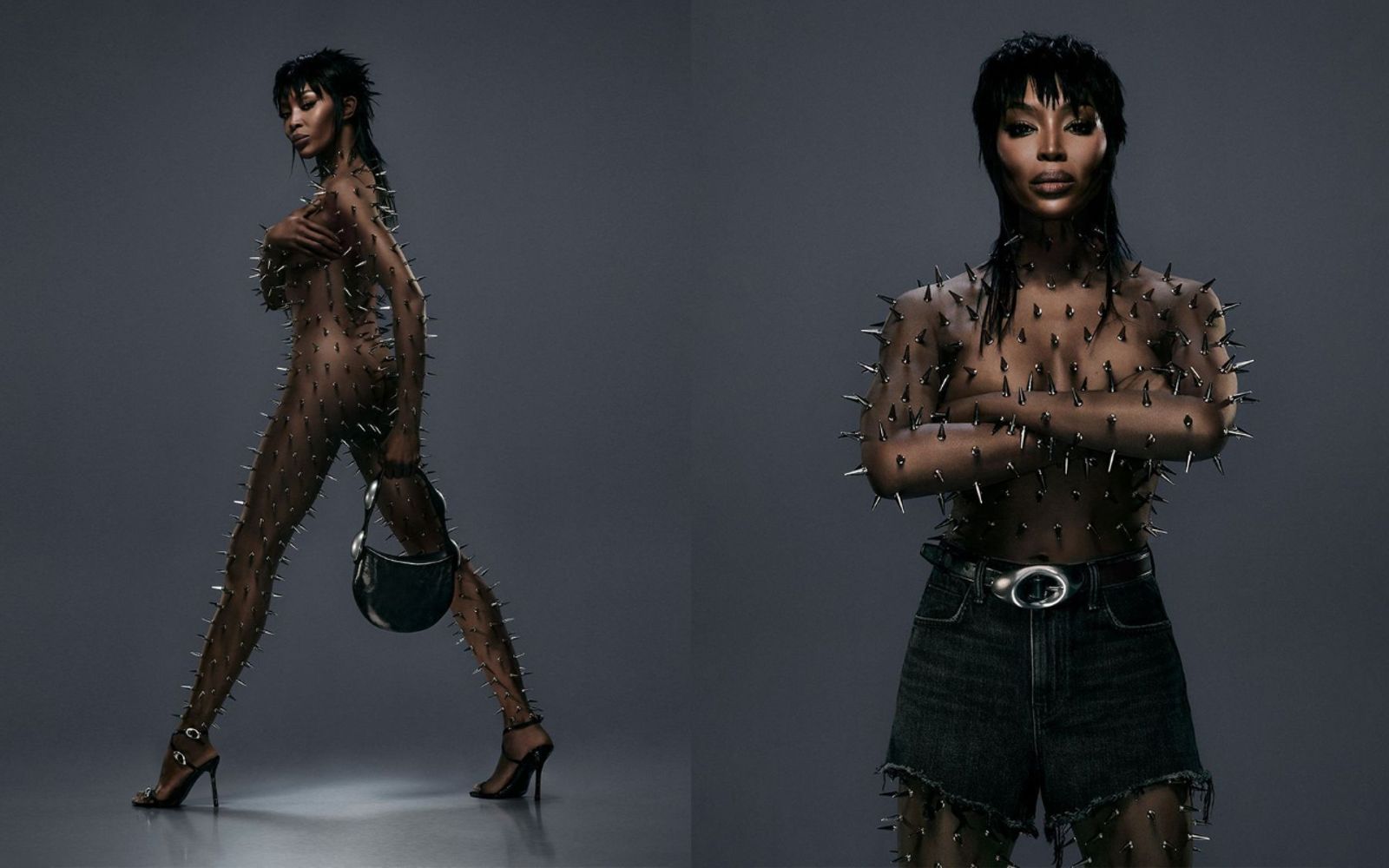 一身滿身是尖刺的造型也很符合娜歐蜜坎貝兒的形象與本性。10年前她曾因故毆打女傭被罰社區服務,最後一天可是撂來一部勞斯萊斯接送呢!那天,歐蜜坎貝兒特地穿上豔光四射的禮服,無謂他人的目光與流言蜚語,她大步向前,就連妖嬌扭動的背影都充滿力量。