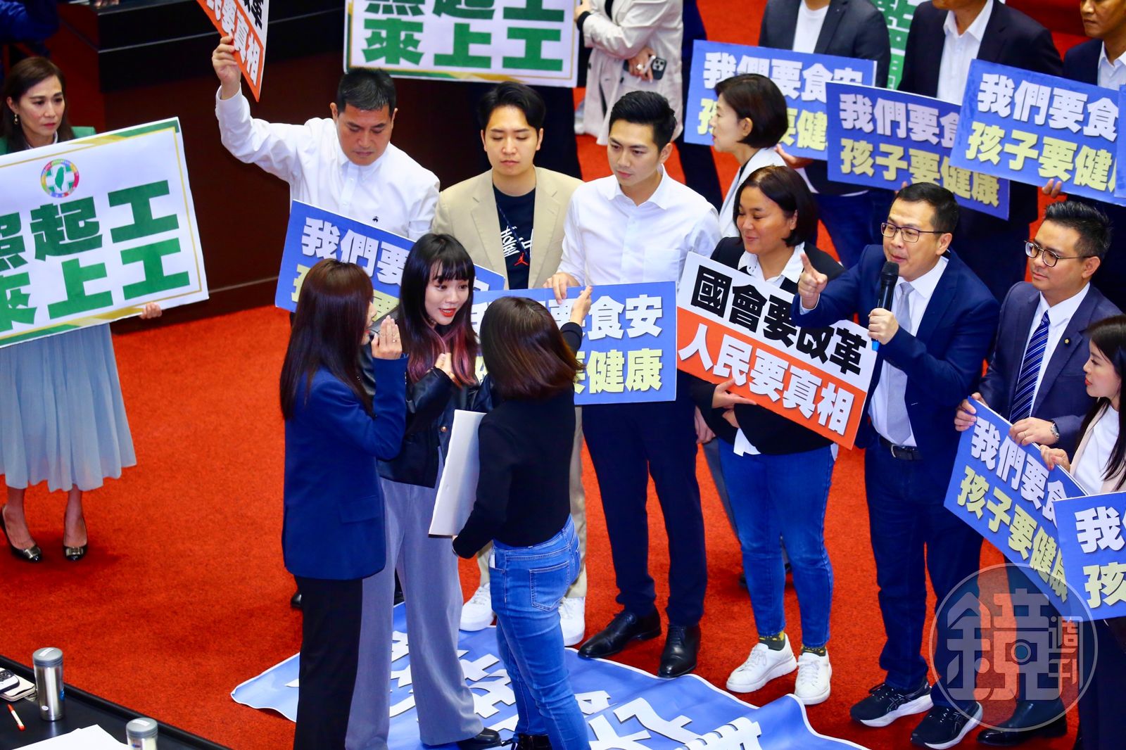 而後徐巧芯、王鴻薇等藍委拿麥克風開始一連串持續批評,其他藍委也穿插拿麥克風不斷喊話要陳建仁做食安報告等,不過綠委也不甘示弱在台下高聲回罵,一旁的綠委王世堅、沈伯洋則是站在質詢台旁看起來十分無奈。