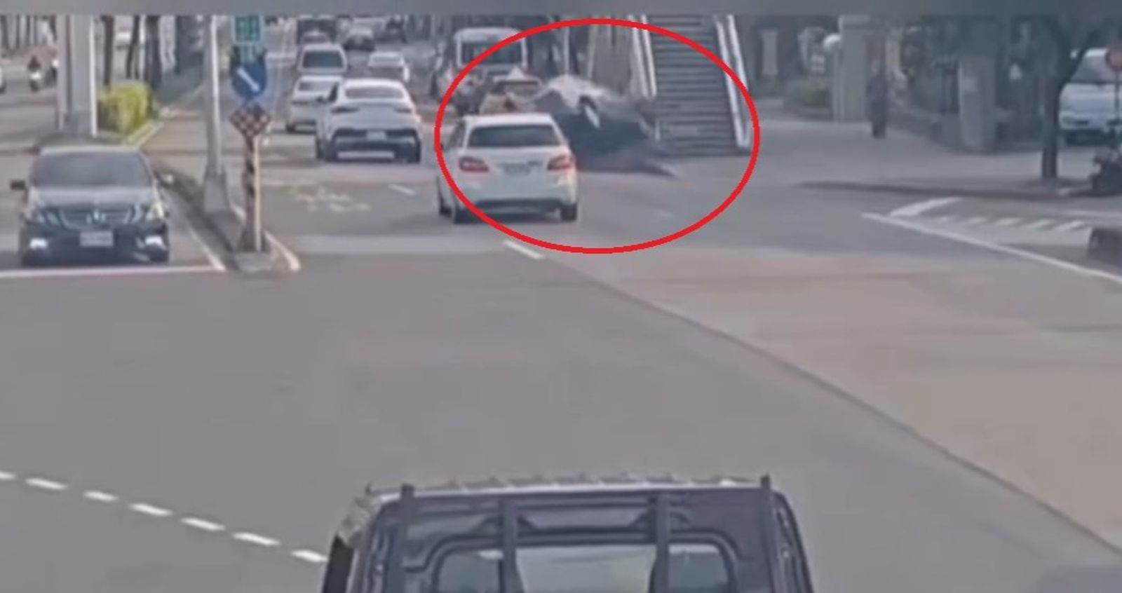 無辜女騎士遭騰飛的轎車波及,連人帶車被壓在輪下。(翻攝畫面)陳女被撞後連人帶車倒地,經送醫後膝蓋骨折、四肢擦挫傷,肇事廖男表示,他因前一晚失眠,精神不濟,才會開車開到一半打瞌睡,直到撞擊後才驚醒自己釀禍,警方通報拖吊車及環保局到場排除事故現場,經查廖男酒測值為0,確認無酒駕情形,詳細車禍原因尚待進一步釐清。