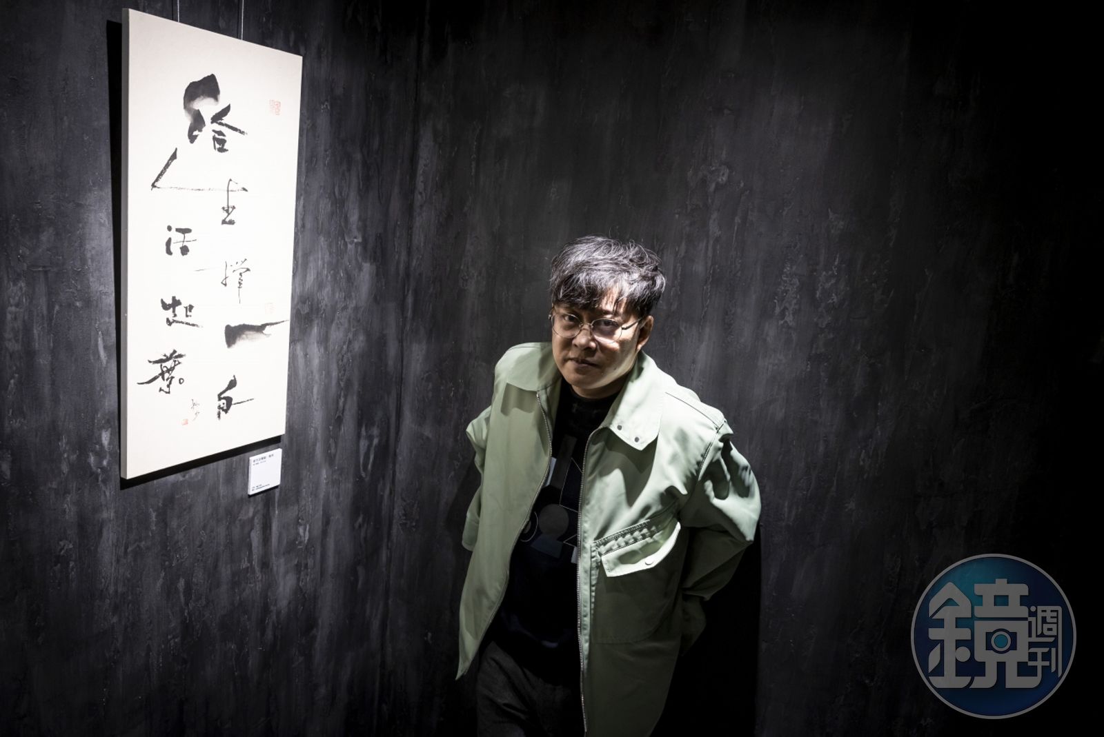 他引領我們看展,字畫中,他將林憶蓮《至少還有你》的歌詞填進一隻水墨鯨魚的肚子裡,寫著:「哪怕人潮如孤單深海,知音快要滅絕,能聽得懂我五十二赫茲微弱心聲的,至少還有你」,他也用宛若席德進的水墨詮釋王菲《紅豆》裡被情人看透的風景和細水長流,情感深深淺淺,濃淡不一。他也懸腕寫一個大大的「追」字,一撇一橫,一氣呵成,模擬張國榮歌聲裡的迫切,只想追趕生命裡 一分一秒,「每一副字畫都有設計感,回應歌詞某個有關的意見,那時候為什麼會拿起毛筆這個工具,是因為書法的傳統都讓我們搖頭擺腦,不是對聯啦,就是詩詞歌賦,我沒說那樣不好,只是有點讓毛筆書法藝術有點限制了。」