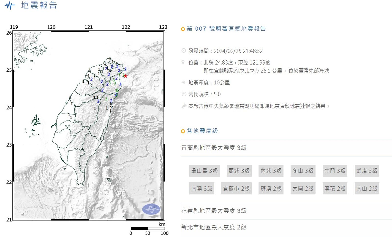 2024.02.25 22:04 臺北時間台北有感!21:48宜蘭東部海域規模5.0地震 最大震度3級時事今晚宜蘭東部海域發生芮氏規模5.0地震。(翻攝自氣象署官網)發布時間:2024.02.25 22:04 臺北時間更新時間:2024.02.25 22:04 臺北時間文 謝文哲已複製連結贊助本文加入訂閱會員宜蘭地震海域中央氣象署今晚(25日)地牛翻身!據中央氣象署資料顯示,今晚9點48分32秒在外海發生芮氏規模5.0地震,震央位於宜蘭縣政府東北東方25.1公里東部海域,深度10公里,最大震度3級。氣象署指出,各地最大震度為宜蘭縣、花蓮縣3級;新北市、桃園市、新竹縣、南投縣為2級;1級則有基隆市、台北市、台中市、苗栗縣、彰化縣、雲林縣。更新時間|2024.02.25 22:04 臺北時間延伸閱讀人妻下廚獻殷勤「出家婆婆一口不吃全倒掉」 網見菜色吐槽:不能吃的全湊齊了【有片】鹿耳門元宵煙火爆炸人群驚逃 夫妻手臂濺血!聖母廟致歉了【有片】團隊出包「歌神險爆假唱」 張學友變臉攤手畫面曝光藍委閉門投票「禮讓民眾黨1席召委」 媒體人酸:沒那個屁股就不要吃瀉藥支持鏡週刊小心意大意義小額贊助鏡週刊!贊助本文每期 $35 元動態話題報導無限閱讀解鎖新鮮事加入訂閱會員鏡週刊加入追蹤訂閱下載鏡週刊加入追蹤訂閱下載更多內容,歡迎 鏡週刊紙本雜誌、鏡週刊數位訂閱、了解內容授權資訊。獨家深度分析報導線上閱讀