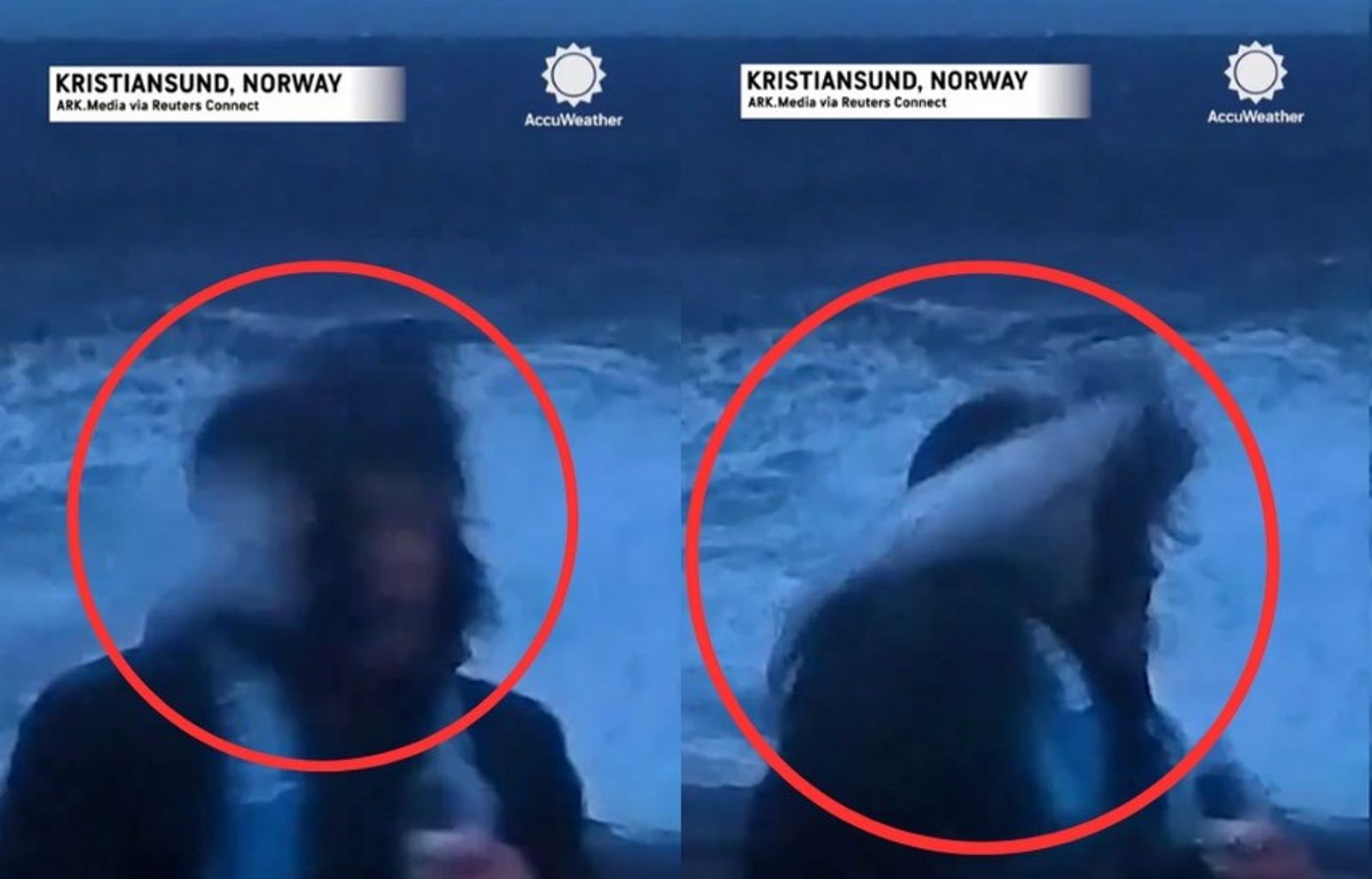 影片可見,挪威這場風暴的威力相當大,記者跑到海邊播報,攝影師喬根瓦格(David Jørgenvåg)則拍下這一幕。不過就在記者播到半途,突然間有一條「飛魚」飛越鏡頭前,更直接狠狠對記者「巴頭打臉」,導致記者一個重心不穩,跌坐在石頭上,但隨後大浪馬上打來,導致記者差一點被捲走。
