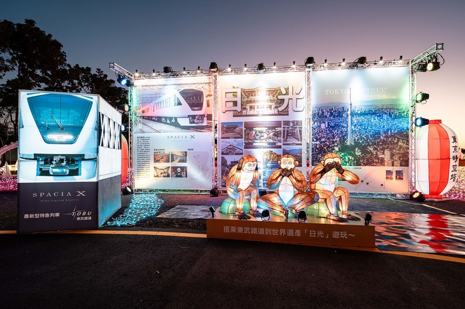 連續多年必定參加台灣燈會的東武鐵道集團,今年將東京經典地標東京晴空塔燈座設計成黃金版,還有世界遺產日光的東照宮標誌性三猿「不看、不說、不聽」的寓意燈座以及以東武鐵道最新型特急列車SpaciaX車廂外觀設計而成的燈座。