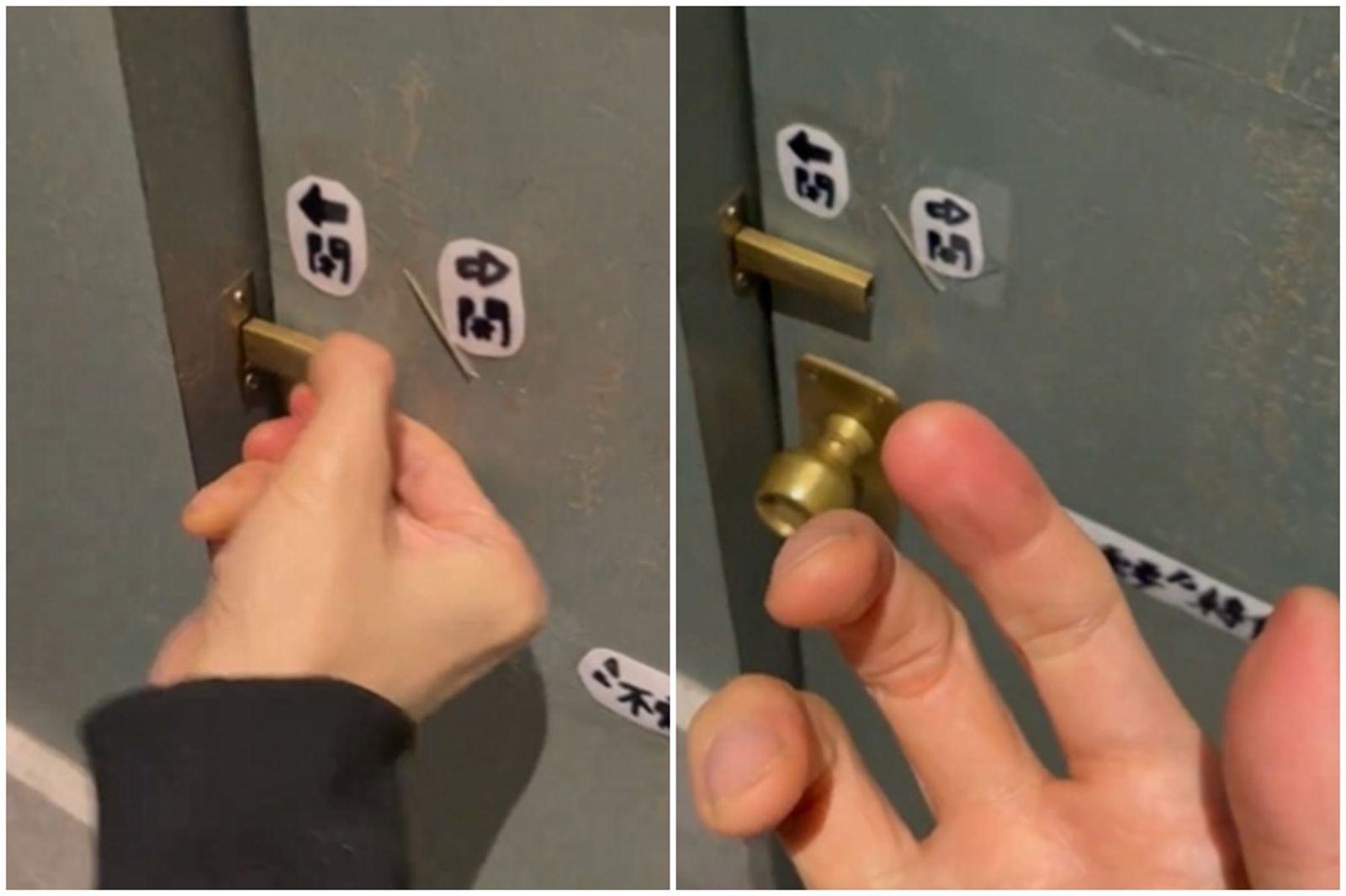 影片中可見,Yashiro Azuki著急將插入門鎖的門栓左右滑動,嘗試打開廁所門,但照著上面指示「左關右開」,仍是打不開門,最後他還擺出一個攤手的動作,甚至配上中日文字,希望能尋求幫忙。