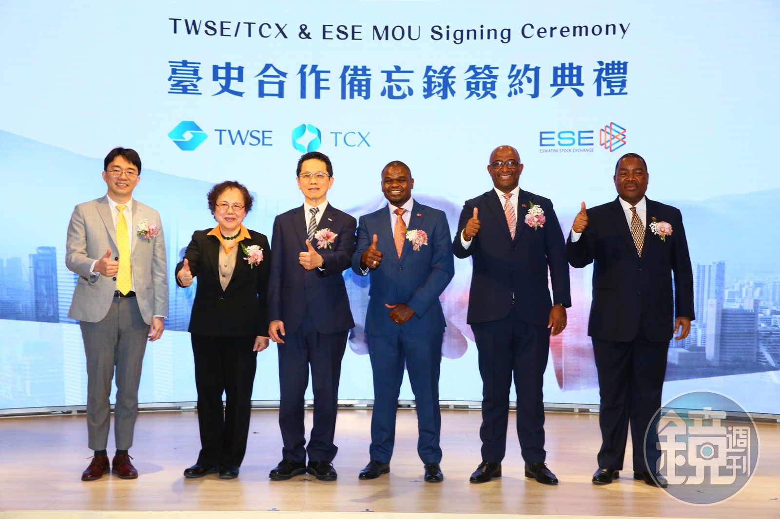 簽約典禮由臺灣證交所簡立忠總經理、碳交所田建中總經理與ESE CEO Ncamiso Ntshalintshali代表簽約,並邀請金管會蕭翠玲副主委、史瓦帝尼央行總裁Dr. Phil Mnisi及史國駐台大使Promise S. Msibi擔任見證人。此外,證券櫃檯買賣中心董事長陳永誠、臺灣期貨交易所董事長吳自心,臺灣集中保管結算所董事長林丙輝等人也特別與會。
