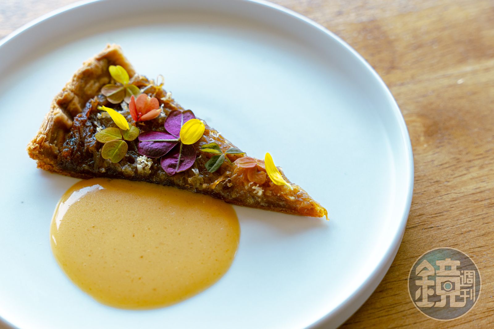 接著上桌的是菜單上標示「Radish」的鹹派,薄脆的派皮上盛放著似乎經過無數工序熬煮的「蘿蔔」,面上鋪滿色彩繽紛的食用花,酸鹹甜兼具,風味複雜而迷人。繼之而來的是優遊在牛肉清湯中的義大利麵餃,湯頭極清極鮮,麵餃包的是黑松露奶油,是純正的義式風味,一口咬下香氣四溢,後來看到別的食客Po文說主廚的義大利麵做得很好,看來Chef Kim的技藝並不侷限在法菜技巧上。