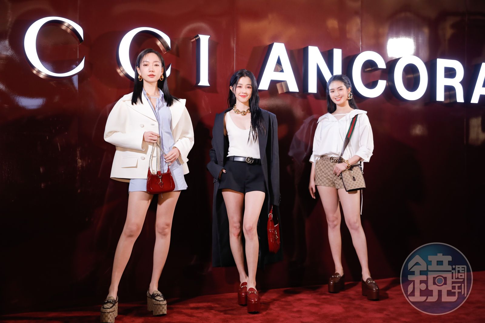 吳卓源穿著淡藍色連身褲搭配落肩西裝外套,Jackie Notte Ancora紅色迷你包NT$126,200、Horsebit樂福鞋NT$50,500。雷嘉汭的五分袖厚綿綢襯衫NT$52,000、GG低腰短褲NT$40,000、Marina Chain手鍊NT$37,900、Original GG小型水桶包NT$72,400、Horsebit樂福鞋NT$50,500。吳卓源以藍白色系的穿搭出席活動,她透露非常喜歡手上的包包與鞋子,而且「我私底下有很多這樣顏色的單品與衣服」;新生代女藝人雷嘉汭受訪時表示,「我喜歡手上的手鍊,有一種經典回歸的感覺,而且它非常有份量又顯眼,很好搭配」。