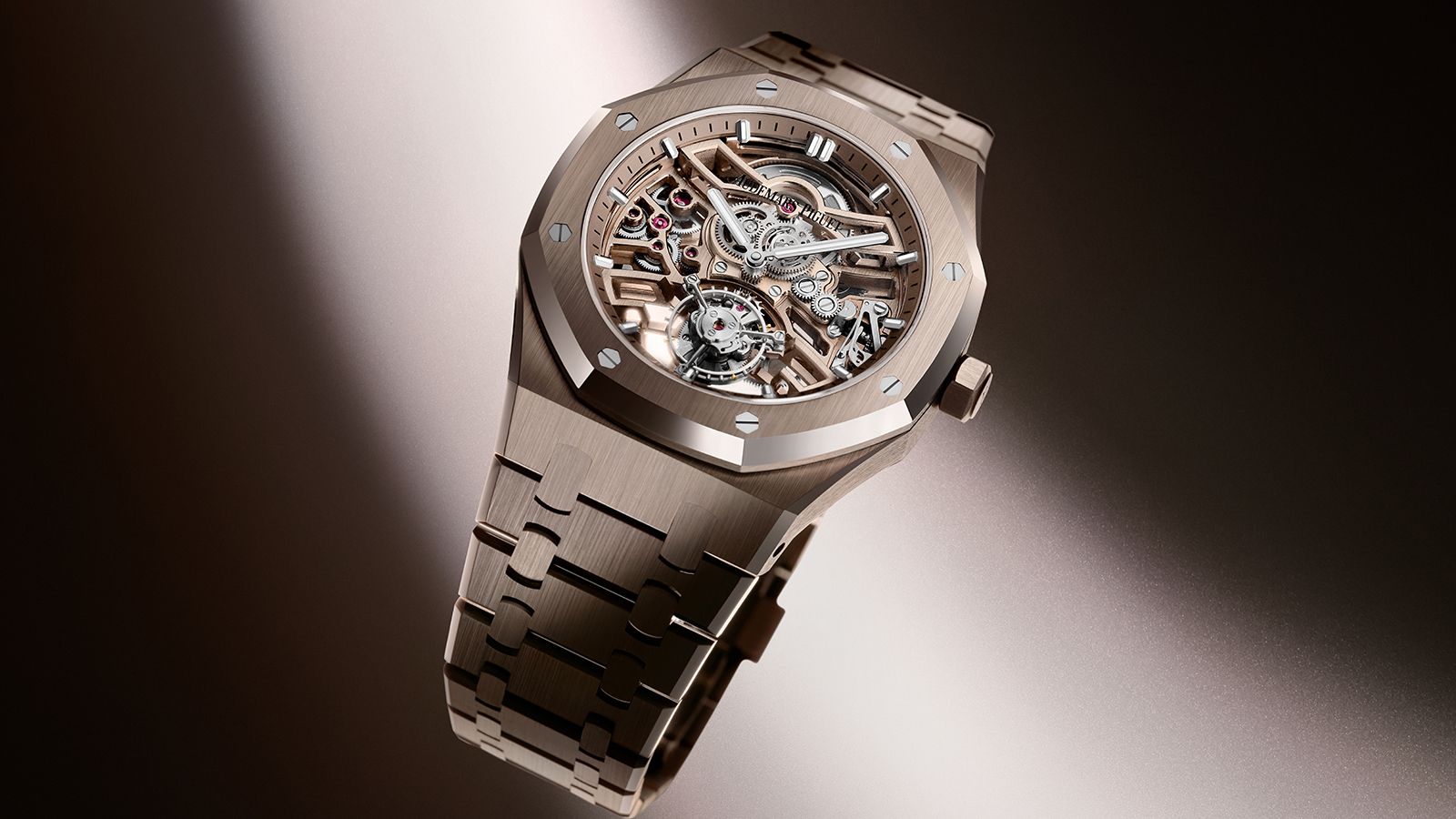 同樣是材質的變化,AP以一種新式18K金的沙金材質,呈現介於白金和玫瑰金之間的顏色,打造出一款皇家橡樹的鏤空飛行陀飛輪,以電鍍呈現的沙金色調結合鏤空機芯,是它在視覺上的一大特色,而且隨著光線的變化和角度的不同,會呈現出不同色澤,在顏色的表現上很有新意。