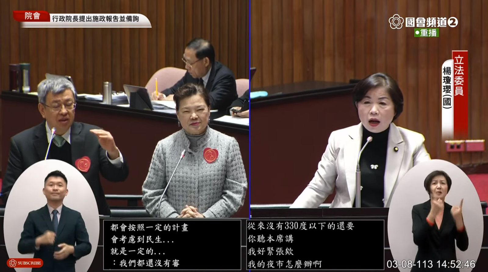 楊瓊瓔說,現在民生很痛苦,薪資沒有漲,通膨很嚴重,連330度以下都要漲,影響的產業會有多少,問經濟部是否有做好配套?還要院長和部長去夜市看看,「都沒什麼人了捏!」陳建仁重申,電費調整會照計畫和相關配套來精準調整,王美花則澄清,夜市內需其實去年都創新高。