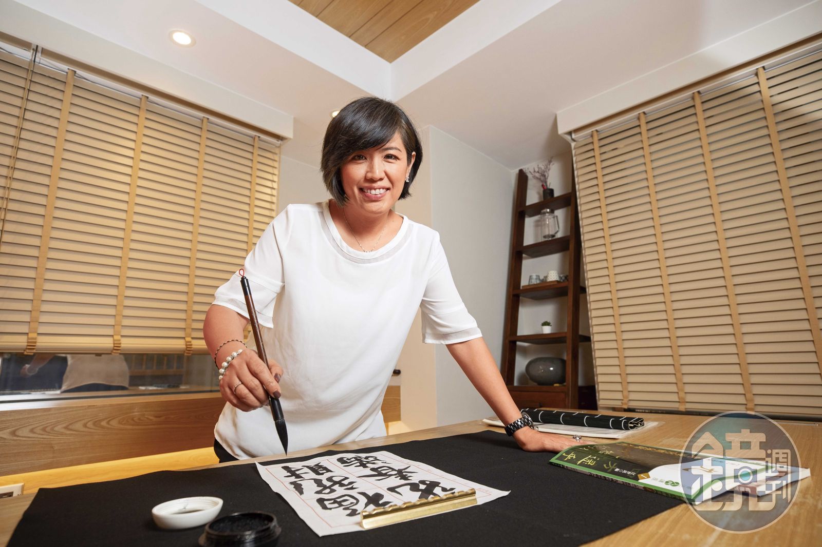 「寫書法講究尺度,要專注調氣,細心觀察,了解其中軌跡、角度…」採訪這天,林恩如穿著白色上衣邊寫邊說,「每個字體結構不同,有粗有細,運筆方式讓每個字都能展現出不同姿態,像這裡就要回鋒。」