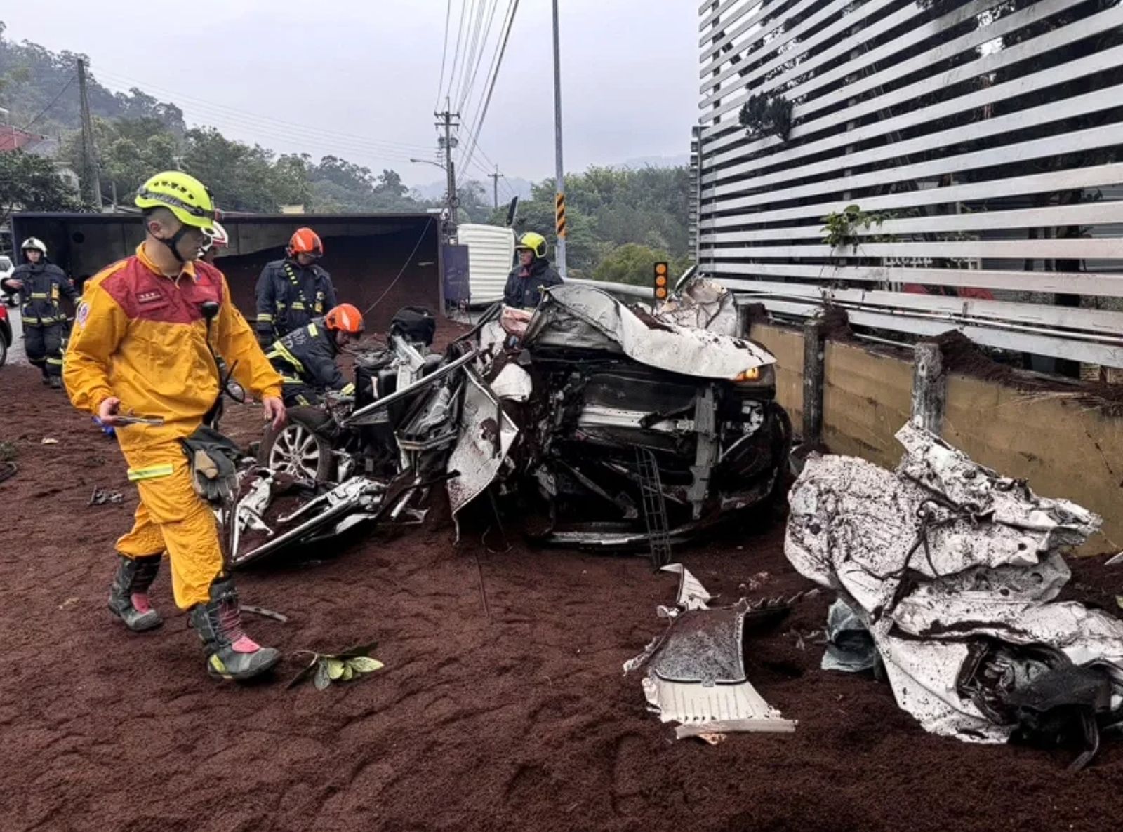 警消獲報立刻到現場搶救,被壓成廢鐵的休旅車內,一名43歲的廖姓母親被救出時沒有生命跡象,19歲的吳姓兒子意識不清,有嚴重創傷,砂石聯結車駕駛也被救出,3人送醫搶救。