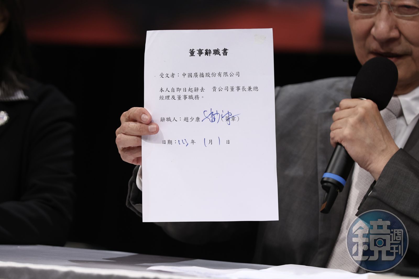 趙少康帶著以中廣董事長身分接受國民黨徵召參選,選前就被質疑他不辭董事長是因為對於勝選沒信心,一直到今年1月1日的副總統辯論會上,趙少康才突然在台上秀出辭職書,簽字請辭。