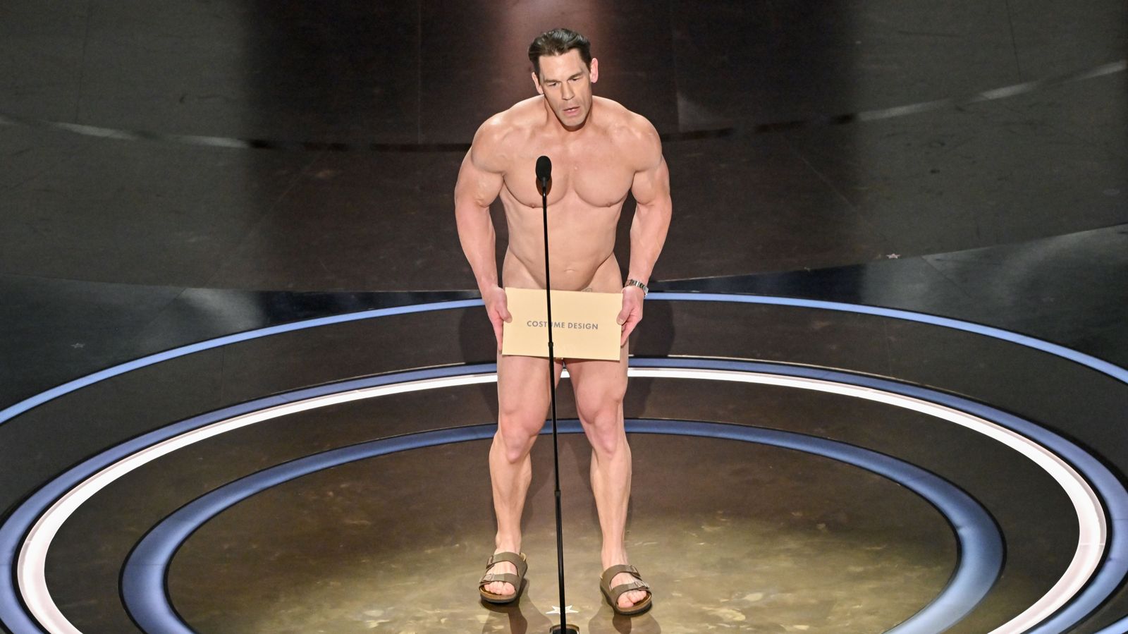 一開始主持人吉米金莫(Jimmy Kimmel)開玩笑說:「大家可以想像現在有人要全裸上台嗎?這樣玩會不會太大了點?」然後約翰希南就真的全裸,只用裝著得獎人名字的大信封遮住重點部位出場了,對吉米大喊,「這種場合你居然想得出這種點子,真的很羞恥。」吉米反嗆:「這應該很好玩的呀!男性裸體一點也不是什麼笑話!」約翰希南就說:「我沒辦法開信封了啦!」因為一放手就穿幫了。