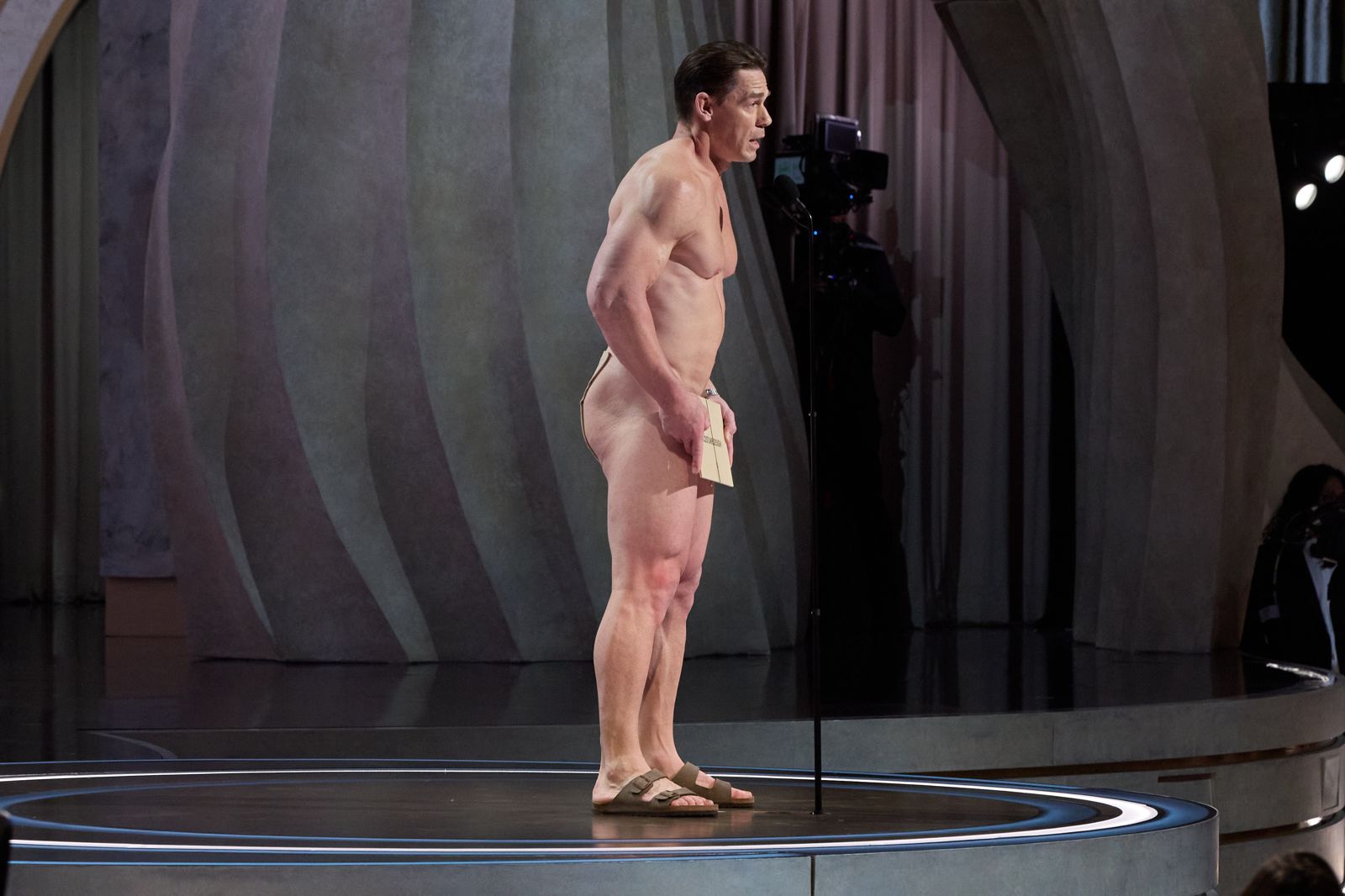 關於約翰希南(John Cena)在第96屆奧斯卡頒獎典禮,僅以得獎人信封遮住第三點,全裸就站在舞台上的舉動,大家都在猜怎麼玩這麼大?真的全裸都沒穿嗎?當然不是啦!