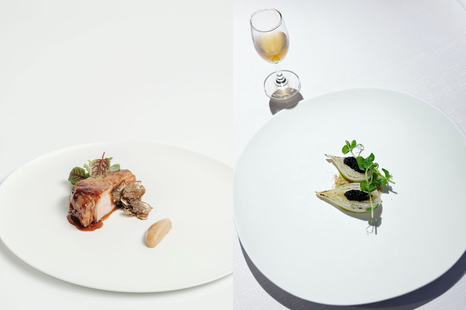 新一季8道菜式中,由經典菜色「後院」譜出序曲,切至極致薄片的黃瓜搭配蠔味香草奶醬,清爽得恰到好處。接著冷湯「花舞」接續,以杏仁、雪莉酒醋基底製成的冷湯風味濃郁,點綴上蘋果與椰奶,風味酸酸甜甜。