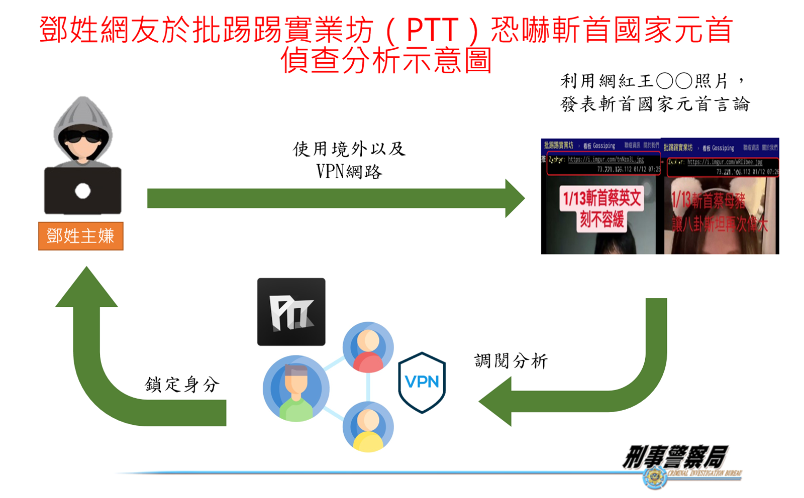 本案犯嫌透過境外IP及VPN發文躲避追查,惟經專案小組透過資料分析,鎖定民眾鄧男涉有重嫌。經通知鄧嫌於2月29日上午對於張貼相關貼文到案說明,鄧嫌使用帳號「Z○○○○○r」犯案,於批踢踢實業坊散佈斬首國家元首等恐嚇言論,造成紛擾不安,影響國家社會安定甚鉅。