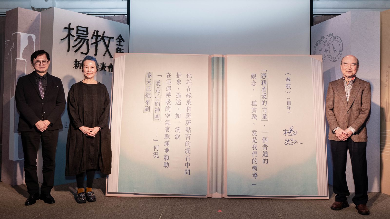 新書發表會現場由三位跨世代作家廖咸浩、陳育虹和蕭宇翔輪番朗讀楊牧詩作及書信,也播放紀錄片《朝向一首詩的完成》的珍貴幕後花絮,重溫作家身影與親聲朗讀。發表會最後的「造詩儀式」由葉步榮、夏盈盈、童子賢三人,分別將楊牧知名詩作〈春歌〉中的三句:「憑藉著愛的力量」「愛是心的神明」「春天已經來到」,填上書本扉頁,象徵一起協力完成這套龐大又豐厚的全集。