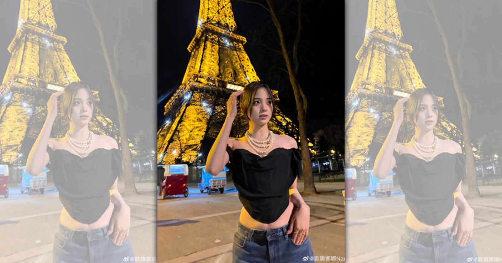 歐陽娜娜幫姊姊歐陽妮妮在巴黎慶生,兩人在巴黎鐵塔下拍了好幾張合照,還以新世代流行的晃動風格呈現,歐陽娜娜身穿黑色低胸洋裝搭配珍珠項鍊,歐陽妮妮則也是黑色風、秀出大片美背,是專屬於姊妹的精心搭配。