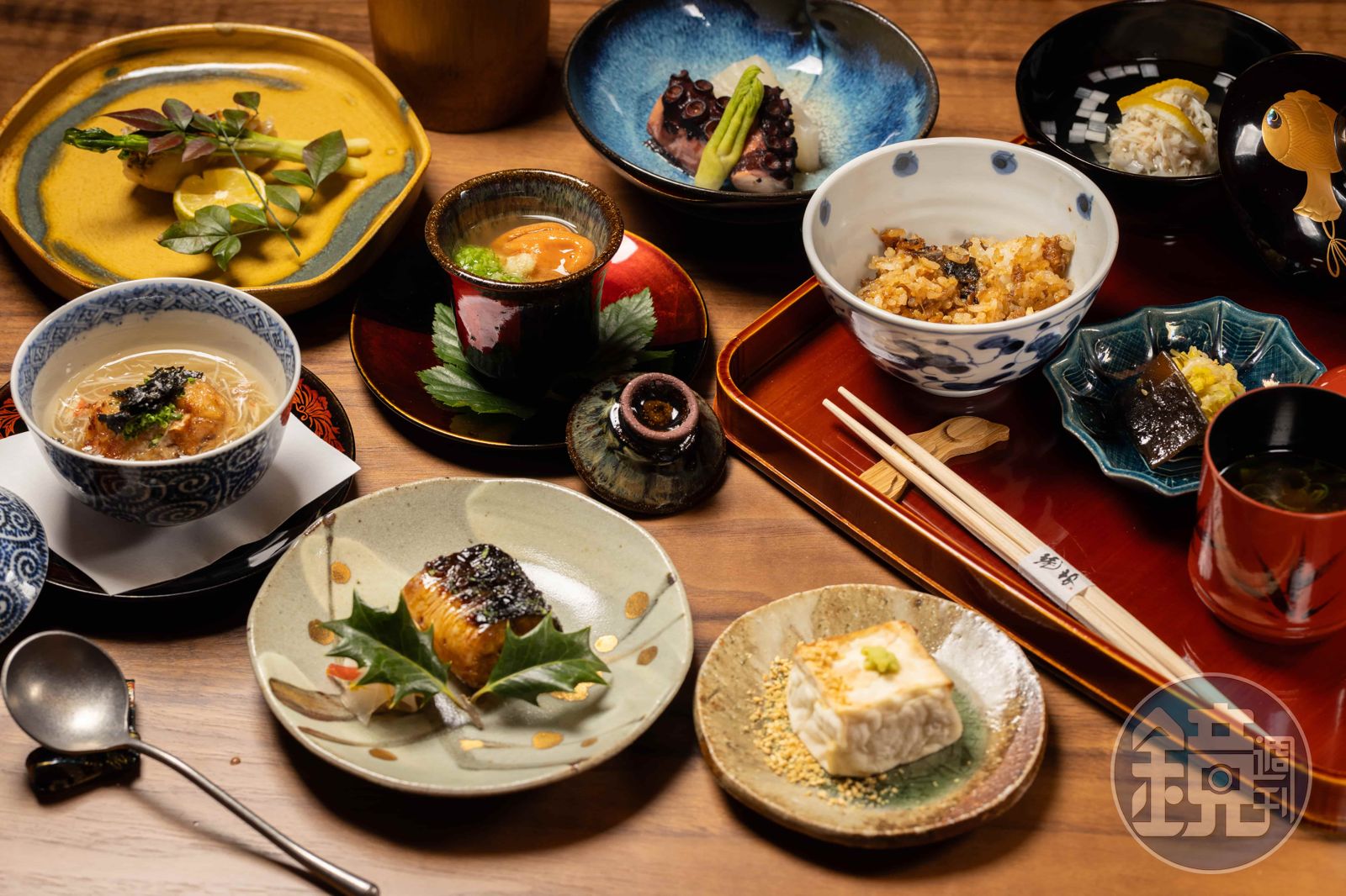 「松葉蟹真丈」上桌時,來不及望向主角,先被切到如同以尺精量過的白蔥吸引,驚嘆連配角都能這麼細膩,也可看出料理長對料理表現的嚴格與要求。日文中真丈意指將肉切碎後加入山藥,使其成型;多數真丈以魚漿與山藥製作占比較多,琥珀的真丈卻以滿滿的北海道松葉蟹絲、海鰻魚與山藥,帶出各式海味的鮮與清甜;「鰻魚印籠燒」則採古老烤鰻做法,鰻魚不對剖,經泡醋、蒸、烤等工序,最後去骨呈盤,形狀像古時候裝印章的小罐子
