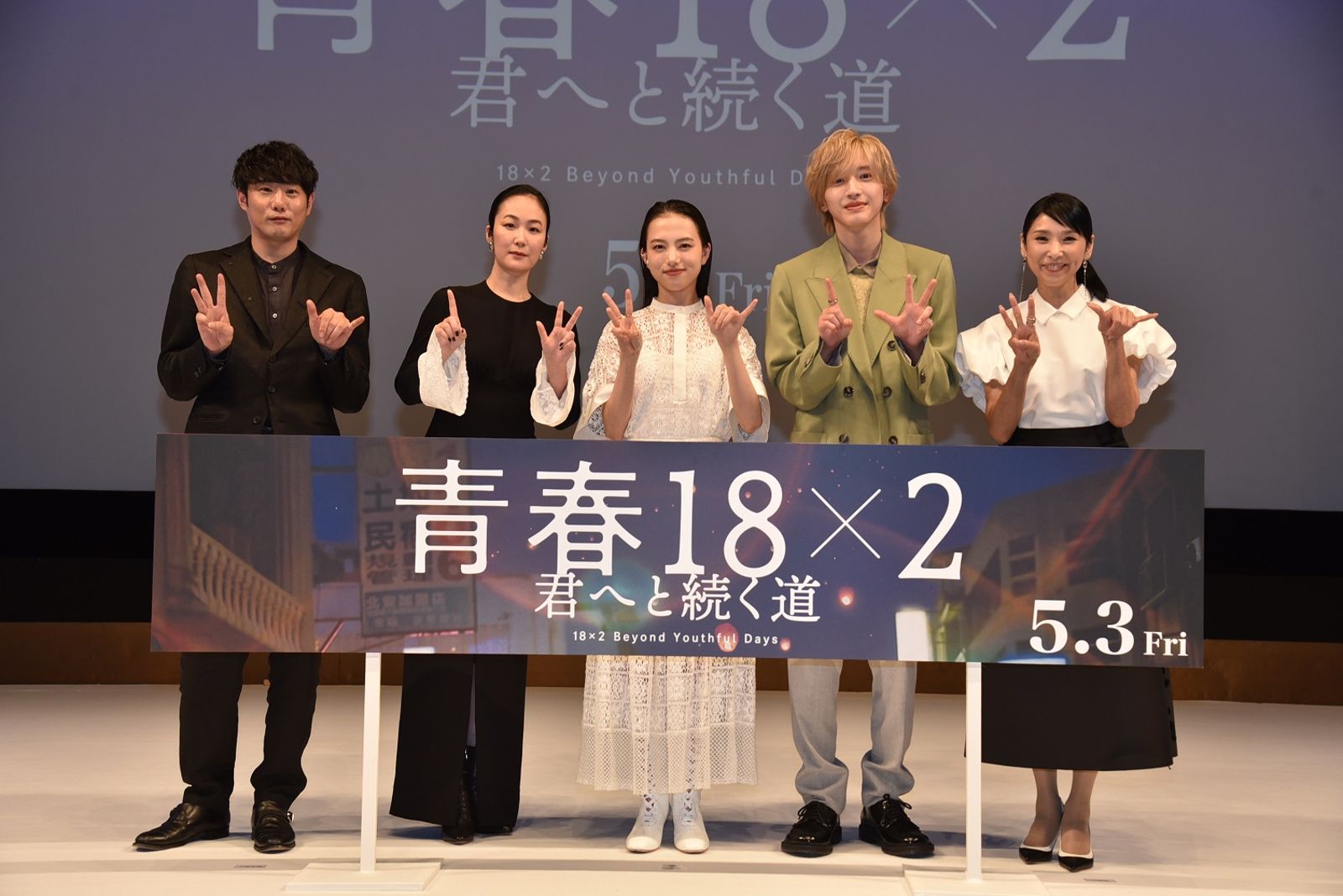 《青春18x2》日籍主創展開在日本的宣傳,包括導演藤井道人(左起)、演員黑木華、清原果耶、道枝駿佑、黑木瞳等人與媒體見面。(翻滾吧男孩電影提供)發布時間:2024.03.20 16:29 臺北時間