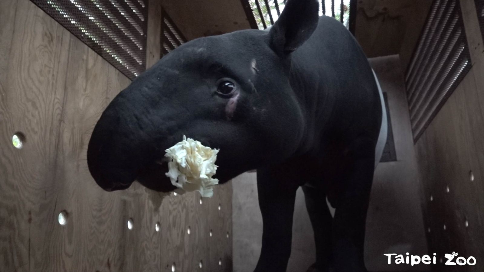 「貘豆」出發前在箱籠裡吃著保育員幫牠準備的飛機餐「高麗菜」,經過二天一夜的旅程,目前已順利入住名古屋東山動植物園新家,大家若有空到名古屋可以順道去看看牠。