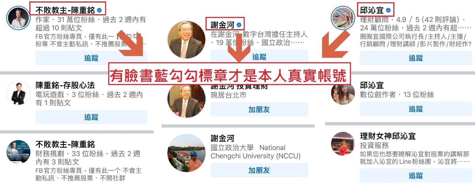 刑事警察局表示,臉書帳號及粉絲專頁應認明藍勾勾認證標章,才是本人真實帳號,真正的名人絕不會主動邀請好友、絕不會帶會員操作、絕不會自稱老師、絕不會要求提供資金,請民眾切勿輕信無認證標章的名人帳號,以免落入詐騙集團的圈套。